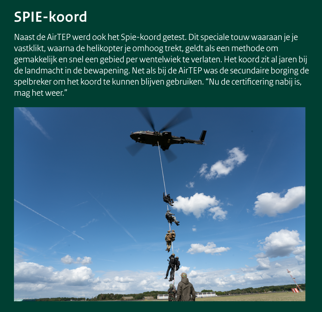 Gelukkig is adjudant-instructeur Ed van Rens een volhardend type. Anders was de AirTEP mooi aan de neus van de Nederlandse special forces-gemeenschap voorbijgegaan. Medio september werd dit vernuftige extractiesysteem op vliegbasis Gilze-Rijen en bij de Vaarschool van het Korps Commandotroepen in Raamsdonk getest.