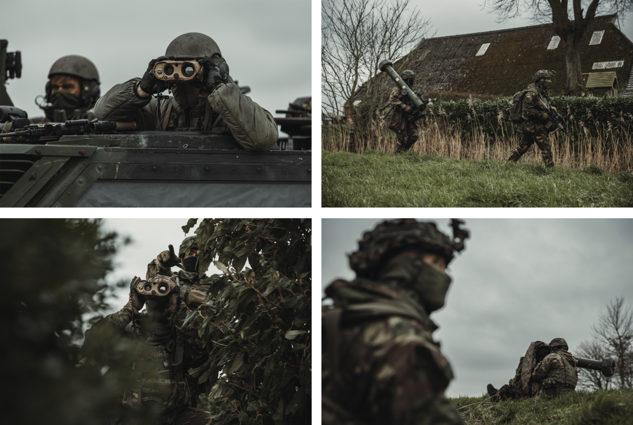 Eigenlijk is dat nu precies wat de deelnemers, het verkennings- en het antitankpeloton, niet willen: zichtbaar zijn. “Maar”, stelt sergeant Ricky, “daar ontkom je hier bijna niet aan. Het vlakke en open terrein biedt weinig mogelijkheden om ongezien te naderen. Voor ons als antitankers is het dan weer een voordeel, het doel is gemakkelijker te bepalen.” Geruisloos gaat het in Warfhuizen trouwens ook al niet, want terwijl de Fenneks zich opstellen, beginnen de klokken van de eeuwenoude Kluizenarij te luiden.