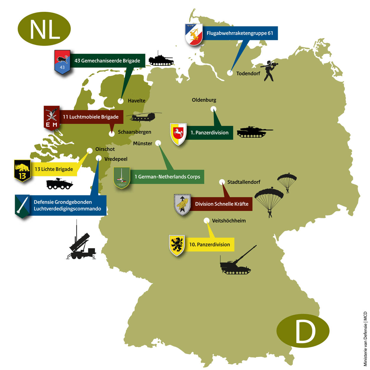 De integratie van 11 Luchtmobiele Brigade in de Division Schnelle Kräfte in 2014, maakte dat voor het eerst een operationele eenheid van de Koninklijke Landmacht deel uitmaakte van een Duitse divisie. Het duurde nog geen twee jaar voordat 43 Gemechaniseerde Brigade het voorbeeld uit Schaarsbergen volgde. Doordat de brigade uit het noorden opging in 1. Panzerdivision, werd het onder meer makkelijker gebruik te maken van Duitse tanks. Essentieel voor de doorgroei van 414 Tankbataljon. Onderdeel van de overeenkomst was overigens ook dat Duitsland medegebruiker werd van het Nederlandse ondersteuningsschip Zr.Ms. Karel Doorman.