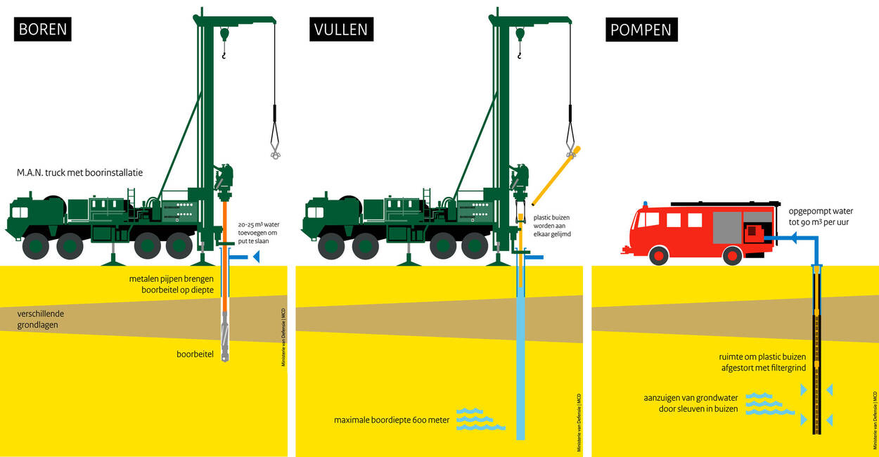 Boormeester sergeant Maarten Boonen hoeft met zijn collega’s korporaals-1 Mario en Marco ‘maar’ tachtig meter de grond in om – zoals dat in vaktermen heet – een watervoerend pakket te vinden. Het gat, veertig centimeter in doorsnee, wordt vervolgens gevuld met kunststof buizen. “Die hebben een doorsnee van 25 centimeter, Daaromheen gaan filterzand en kleikorrels. Die zwellen op bij contact met water. Een lekkere dikke plak grond, om eventuele vervuiling tegen te gaan”, legt hij uit.