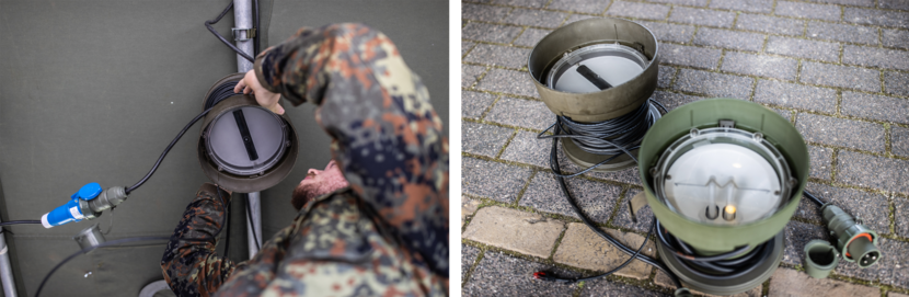Lourens was meteen overtuigd van de militaire toepassing. Maar… “Ik wilde zo min mogelijk losse modules, zo weinig mogelijk bekabeling. Kunnen we de LiFi niet integreren?”, vroeg Lourens zich af. Toen een van de fabrikanten langskwam, aarzelde hij geen moment. “Ik trok een van de bekende groene verlichtingslampen uit de tent. Een uitdaging”, glimlacht hij. “Ik vroeg hen of ze de LiFi ook in onze lamp konden bouwen. Want die lamp, die hang je sowieso op in de tent.”