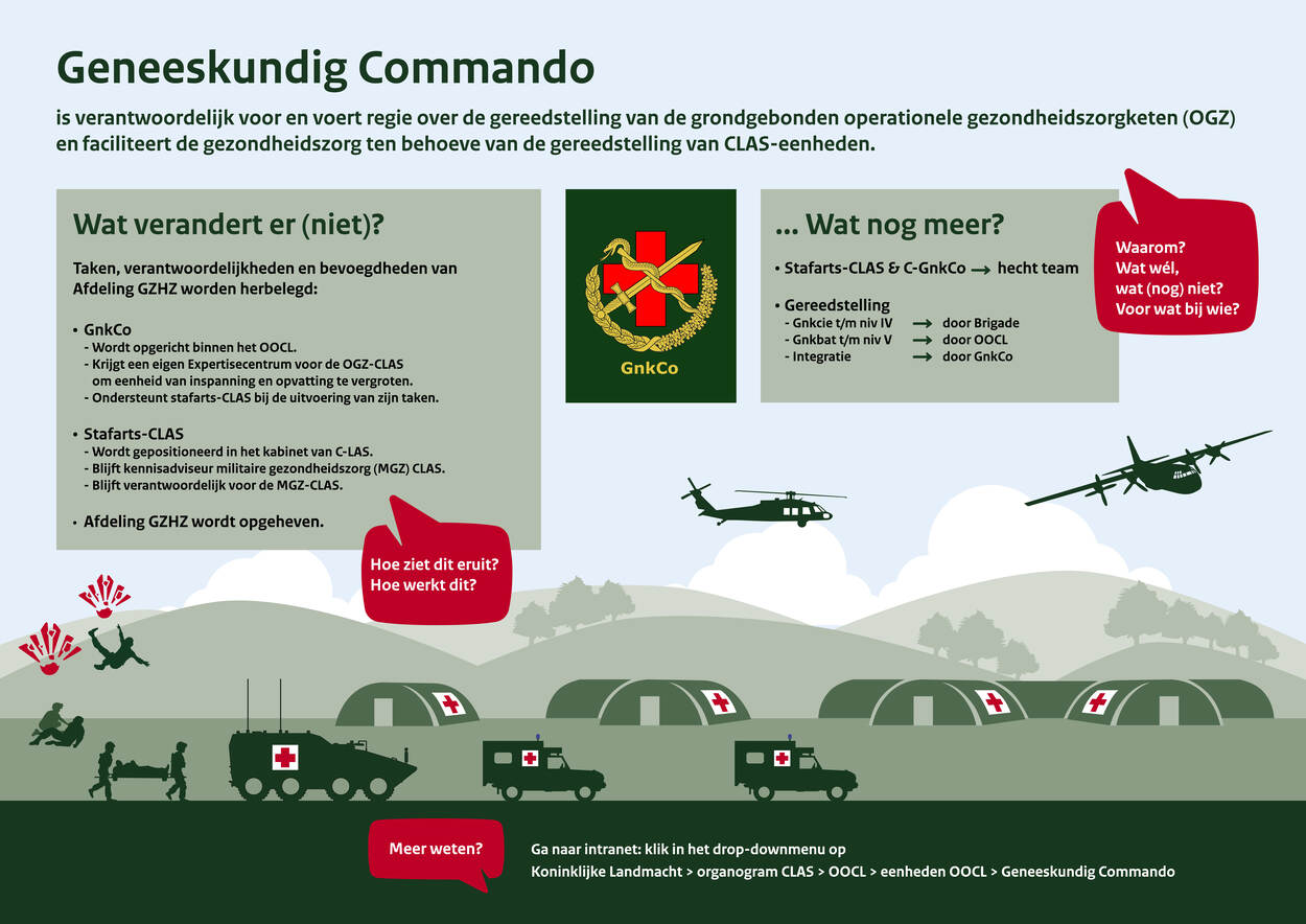 De landmacht versterkt de gelederen met het Geneeskundig Commando. Begin oktober overhandigde C-LAS luitenant-generaal Martin Wijnen de eenheidsvlag aan de eerste commandant, kolonel Henry Bloemendal. Dat gebeurde op de Legerplaats Ermelo, thuishaven van de nieuweling die de regie voert over het ‘gereedstellen’ van de Grondgebonden Operationele Gezondheidszorgketen, bekend als medische afvoerketen.