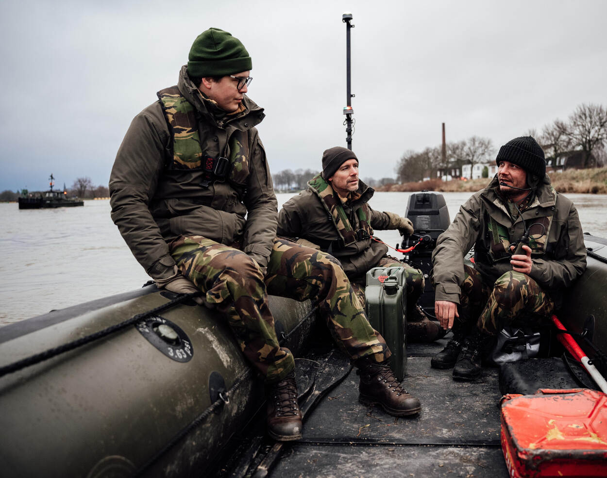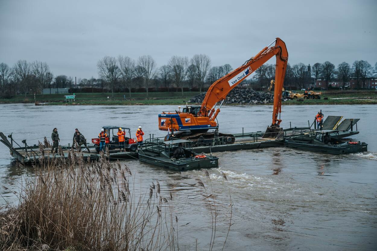 “Onze hulp is nodig, omdat civiele partijen dit werk niet kunnen doen”, zegt hij, terwijl de waterkoude wind aan de oever van de Maas toeneemt. Is een 45 ton zware graafmachine naar de overkant brengen dan geen probleem? “Normaal gesproken zetten we zware tanks over, dus dit lukt zeker.”