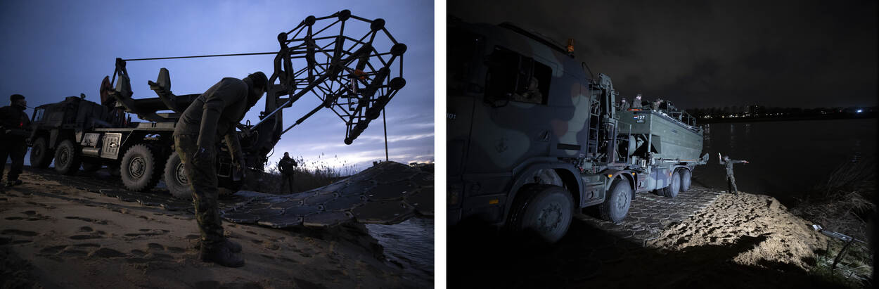 Aan de Maaskade steken de genisten de handen uit hun mouwen. Een aannemer legt een berg zand bij de oever van de Maas, zodat het talud wat vlakker wordt. Een mattenlegger plaatst achteruitrijdend tot aan het water een mat op het zand. Zo kunnen zware voertuigen op een stabiele ondergrond naar beneden rijden. Links en rechts van de mat slaan mannen gigantische haringen in de kade. Hieraan maken ze de pontons vast, zodat die niet wegdrijven als het materieel erop rijdt. Het gebeurt in een vloek en een zucht.