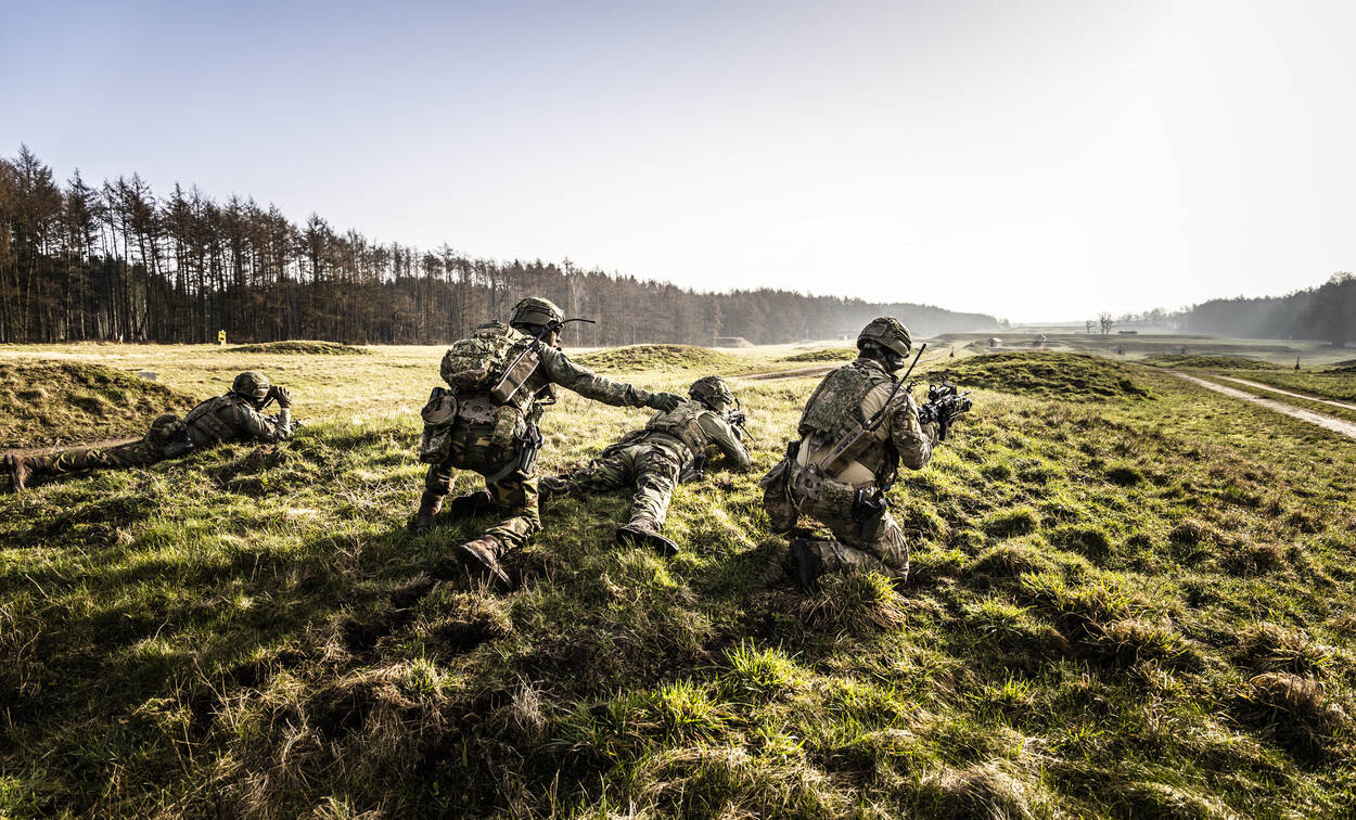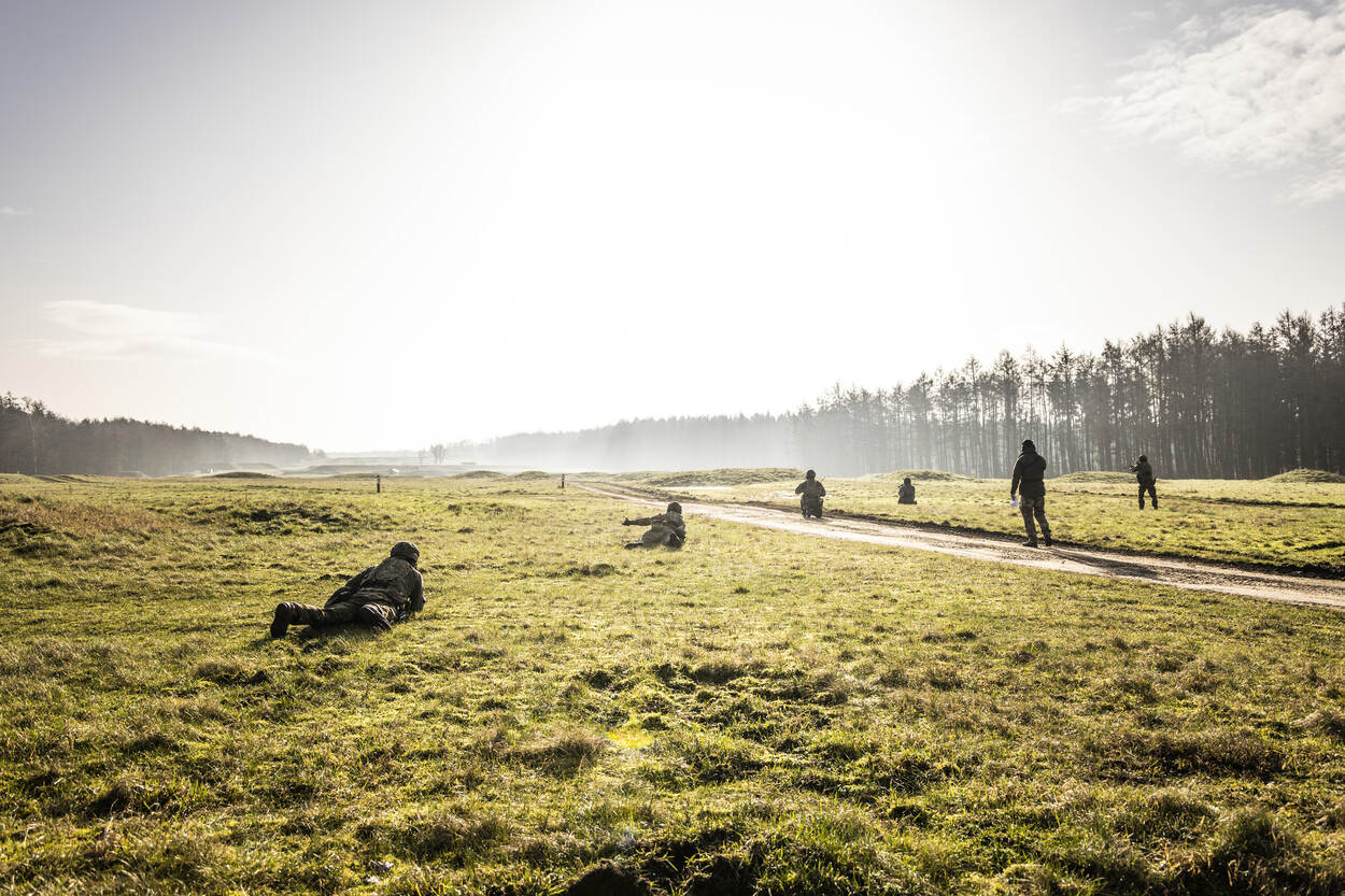 In totaal oefenen vandaag drie groepen, om in actie te komen. Zodra ze het veld inlopen, wordt al snel het eerste vuur geopend. Staand, knielend, liggend; vanuit alle posities worden de vijandelijke linies verderop in het veld onder vuur genomen. De groepscommandant beweegt zich achter zijn mannen en geeft instructies. Op nog geen halve meter daarachter houden de hoofdschietinstructeur en de baancommandant het geheel in de gaten. De groepen zetten drie typen vuurwapens in. In de groep hebben de meesten een Colt C7 bij zich. Daarnaast zijn er twee Minimi’s en de zwaardere MAG. Sergeant-majoor Roel Hoogervorst: “De MAG heeft het grootste kaliber en ‘de verste dracht’. Deze kan doelen tot 800 meter uit de lucht schieten.”