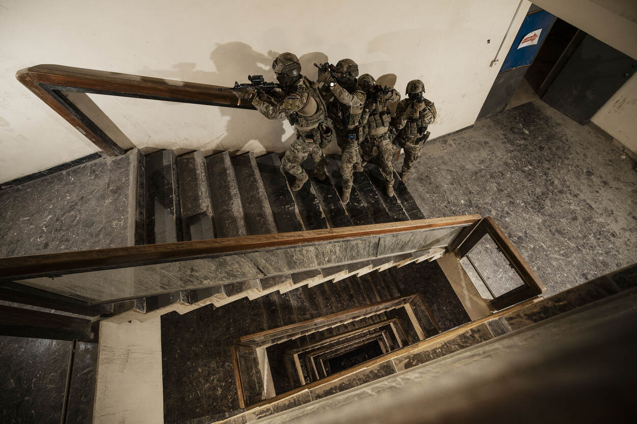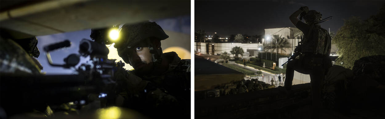 Ook op het kamp UNION III liggen genoeg taken op de luchtmobielers te wachten. Als Force Protection zijn zij medeverantwoordelijk voor de verdediging van de basis. Daarop wordt regelmatig geoefend, net als wekelijkse schiettrainingen en medische scenario’s. “Op het kamp staat het voormalige partijkantoor van de Baath-partij van Saddam Hoessein, een enorm betonnen paleis. Het is een perfecte omgeving om optreden in verstedelijkt gebied te oefenen”, aldus majoor Ewout. “Zo probeer ik met mijn staf zoveel mogelijk afwisseling in taken en locaties te creëren. Ondertussen beginnen we hier al aan het opwerken richting een grote air assault-oefening in de Verenigde Staten.”