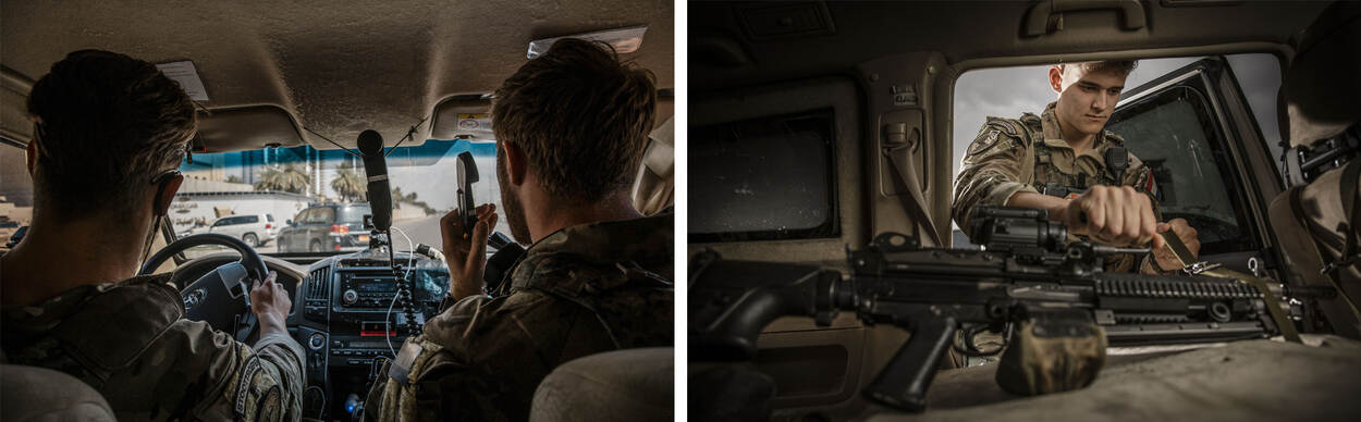 De zon komt langzaam op boven UNION III – sinds begin januari de thuisbasis van de luchtmobielers uit Assen – terwijl soldaat-1 Sheldon met de rest van zijn team de rit voor de dag doorneemt en de Land Cruiser klaarmaakt voor vertrek. Vandaag begeleidt zijn groep een Duitse overste naar zijn afspraak bij de Iraakse artillerieschool. Morgen kan het een sergeant-1 zijn, of een ambassadeur. Sheldon heeft ze als bodyguard allemaal langs zien komen. “Ook al zijn ze al tien keer mee geweest, iedere keer krijgen ze opnieuw de pax-briefing. Want stel dat er iets gebeurt, is het goed dat we er met de adviseur scherp op zijn geweest, zodat die precies weet hoe hij moet handelen en wat wij doen bij een dreiging.”