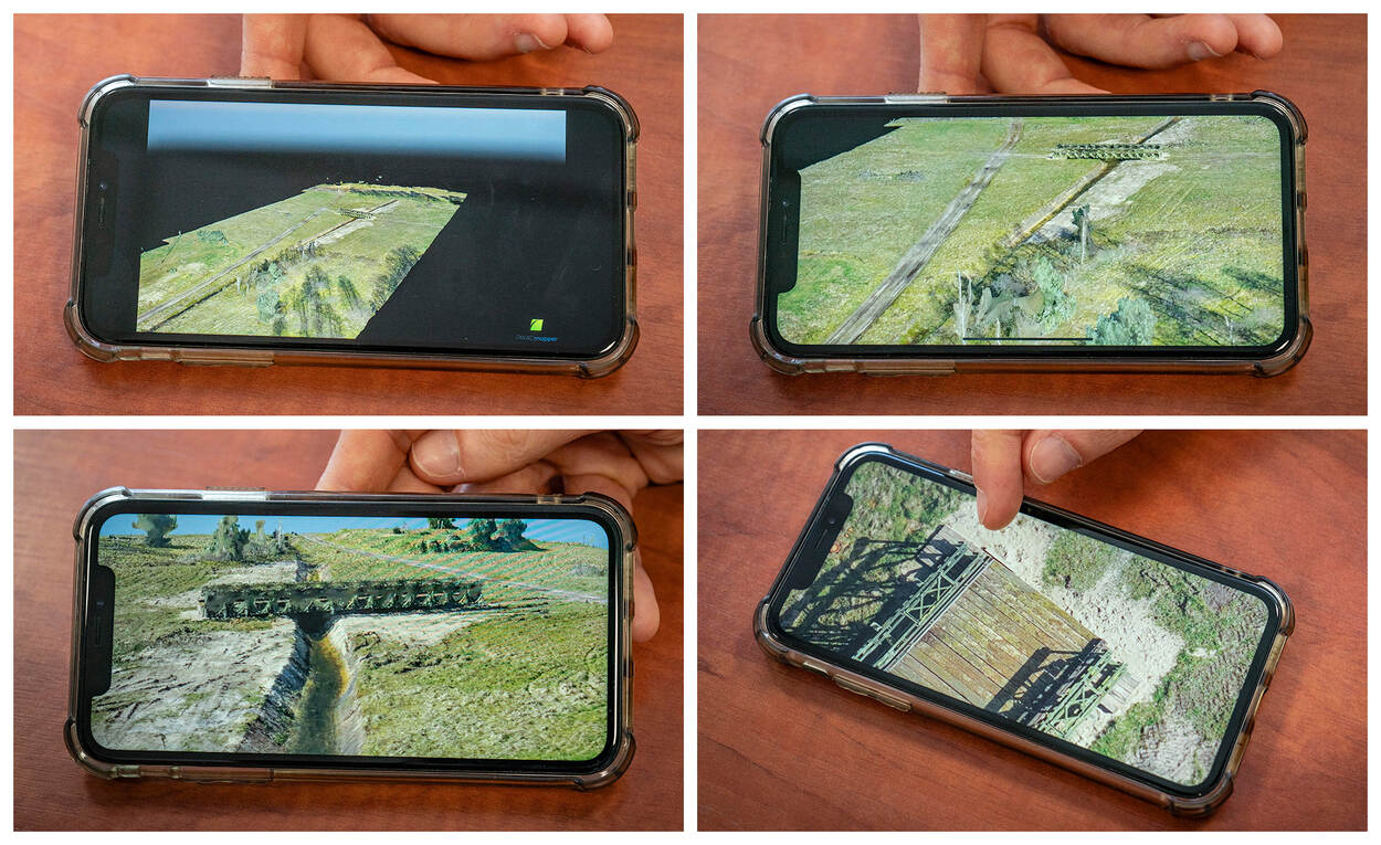 De brug is slechts 1 voorbeeld van velen. Kot laat ook gescande foto’s van een huis zien, waarop de complete kamerindeling tot en met de hoogte van de tafelpoten exact in beeld gebracht wordt. Maar voor de inzet op militair terrein is de ontwikkeling van sensoren onder drones van vitaal belang. Het afgelopen jaar werd daarmee geoefend in de Verenigde Staten. Kot: “We hebben met verschillende drones gevlogen. Hoe groter ze waren, hoe beter de scanner die eronder kon en hoe beter het beeld.” Die beelden werden vervolgens in luttele minuten gegeneerd. Kot: “Alle losse foto's die hij maakte plakte hij aan elkaar om een 2D-plaat te creëren.”