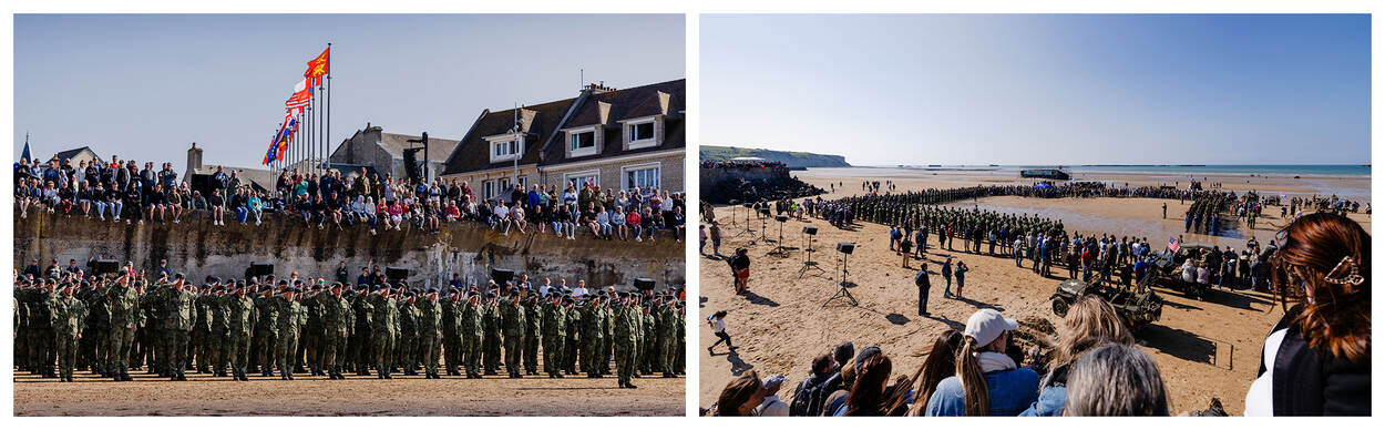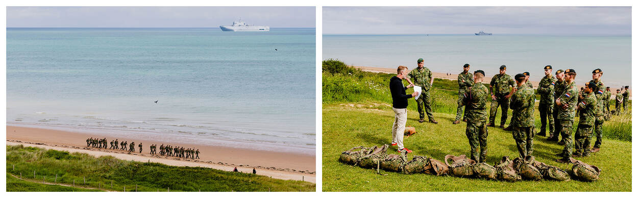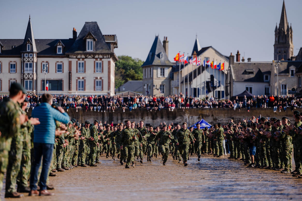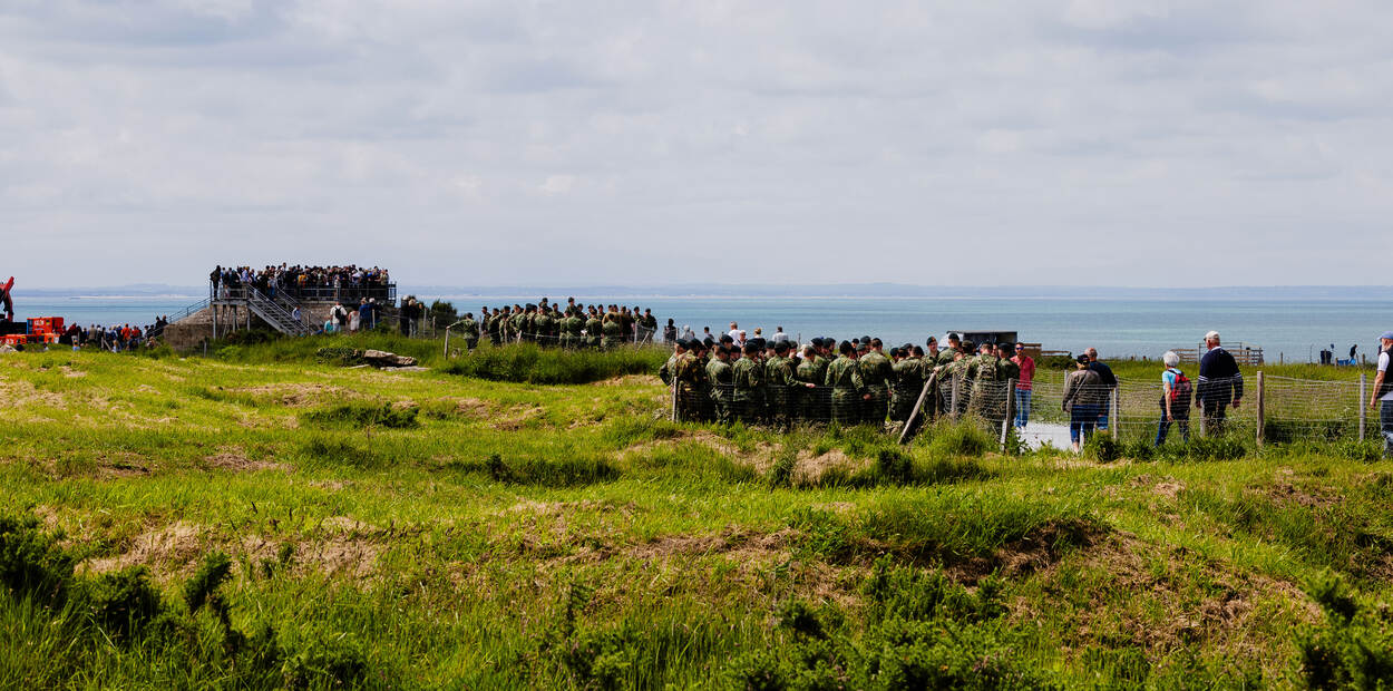 Het strand is ‘historische grond’ voor het regiment. Onder de felle zon zijn de overblijfselen van de kunstmatige haven die hier tijdens de invasie werd aangelegd nog altijd zichtbaar in het water. Omgeven door massaal toegestroomde toeschouwers vormen de militairen een enorme U-vorm rond hun commandant. “Het invasiekoord is een teken van wie we zijn”, geeft Verhoef hen mee.