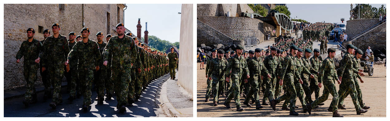 De volgende middag marcheert de volledige battlegroup van hun tentenkamp bergafwaarts naar het strand bij Arromanches. Naast de eenheden lopen genisten, genezeriken en militairen van herstel mee in de wandeling van enkele kilometers. "Links, 1, 2, 3 4", klinkt het door de straten. De aanwezigen die toevallig langs de route staan, houden halt en maken foto’s van de afdalende groene mensenmassa. Een enkeling begint te klappen bij het aangezicht. Het Garderegiment is op weg naar het strand voor een van de hoogtepunten van de reis: de koorduitreiking voor de nieuwe collega’s. Daarmee treden nieuwe fuseliers officieel toe tot het 17e.