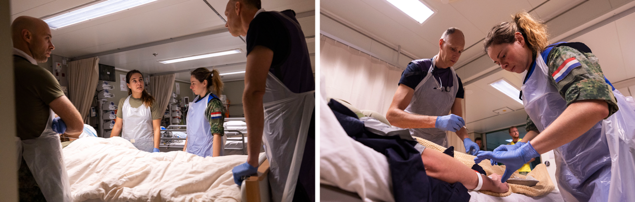 Het chirurgische team bestond uit Nederlandse en Zweedse specialisten, die mede dankzij veelvuldig oefenen uitstekend op elkaar ingespeeld waren. Dat laatste vertelt majoor Martin, traumachirurg en commandant van het Zweedse detachement. Zijn groep bestond uit 12 medici van met name de Zweedse landmacht. Al voor het aan boord gaan waren zij doorgewinterd in het stabiliseren van gewonden, diagnose stellen, gewondenselectie (triage) en -transport, röntgenfoto’s maken, bloed toedienen en meer.