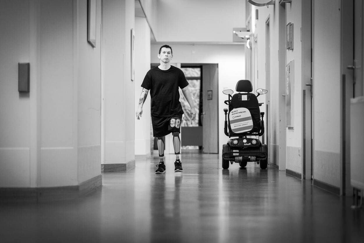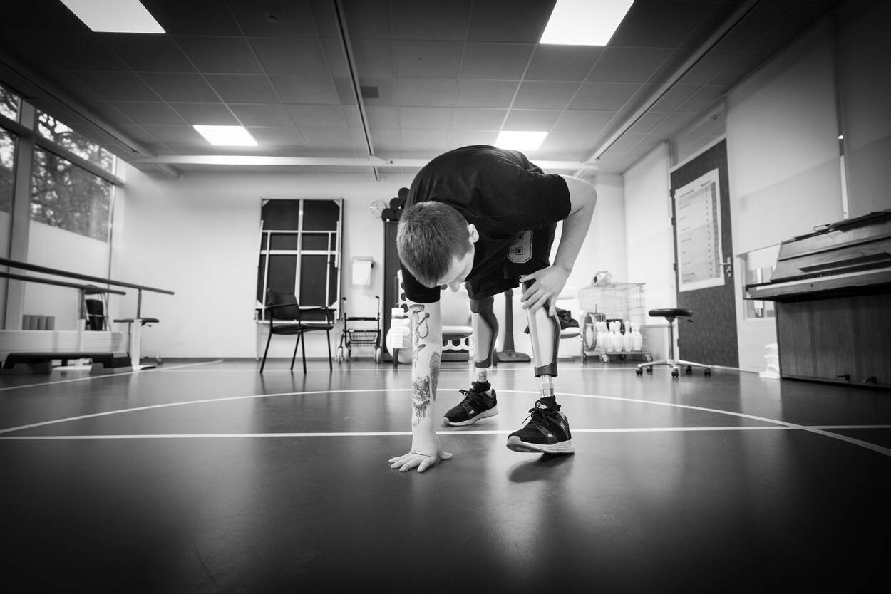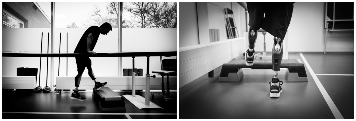 Illia laat het in de oefenzaal allemaal zien. Als een soort breakdancer plant hij zijn handen op de vloer en werkt zichzelf omhoog. Voor zover zijn stijve, nieuwe ‘benen’ dat toelaten. Eerst een hand los, iets meer balans, verder omhoog, andere hand los, dan totale balans. Obstakels ontwijken, plotseling stoppen. Alles bij elkaar duurde het meest intensieve deel van het traject zo’n 8 maanden.