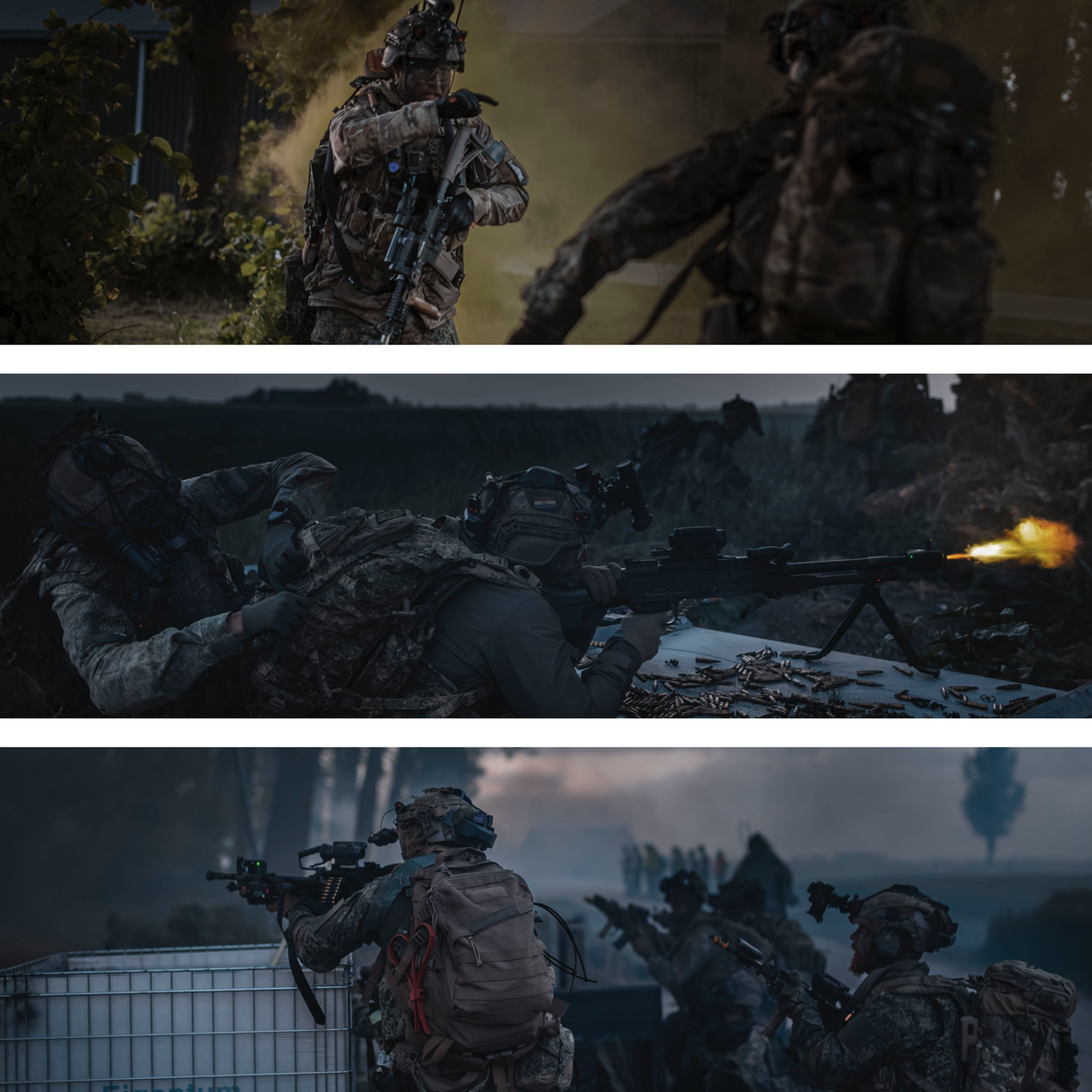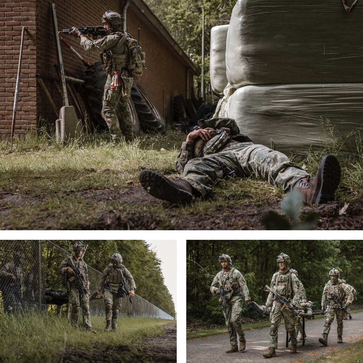Ondertussen staan de Australische herder Knud en zijn bazinnen (‘we liepen er per ongeluk in’) met grote verbazing te kijken naar het brute geweld van de helikopters en de aanstormende militairen van de Charlie-compagnie. Soldaat-1 Wouter merkt dat er sinds hij 6 jaar geleden in dienst is gekomen, heel wat verandert in het optreden. “We zijn in Irak geweest. Daarvoor hebben we ons voorbereid op hoofdtaak 2; het was meer een politie- en bewakingsmissie. Dit is echt grootschaliger, duidelijk voor hoofdtaak 1 (de bescherming van het eigen en Navo-grondgebied, red.).” Collega soldaat-1 Bas is pas anderhalf jaar in dienst. “Jammer genoeg kan ik door een blessure niet echt meedoen. Dit is toch een actie waarvoor je bij 11 Luchtmobiele Brigade zit.”