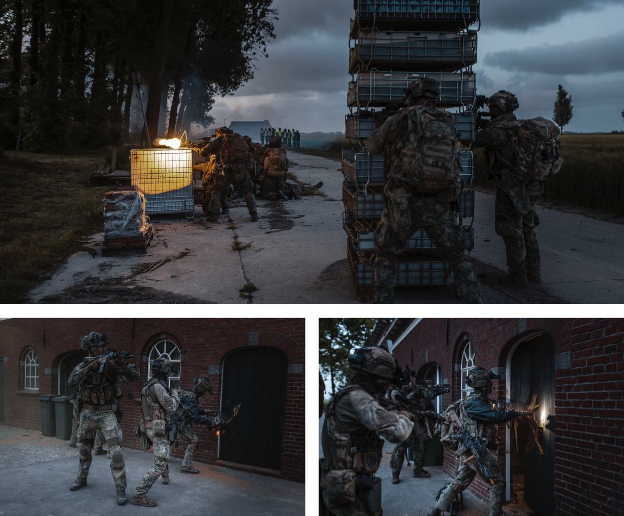 Junior, overste Haspels en zelfs de in witte hesjes gehulde oefenleiders moeten trouwens goed oppassen, want het gaat er hard aan toe. De gebarricadeerde houten deur moet eraan geloven als de zaag erin gaat. “In het gebouw is een dronefabriek en ligt informatie die ze buit moeten zien te maken en dat wil je snel doen”, legt kapitein John uit. Jurjen Meindertsma ziet het lachend aan. “We hebben prima afspraken gemaakt met Defensie, dus dat zit wel goed met die deur.”