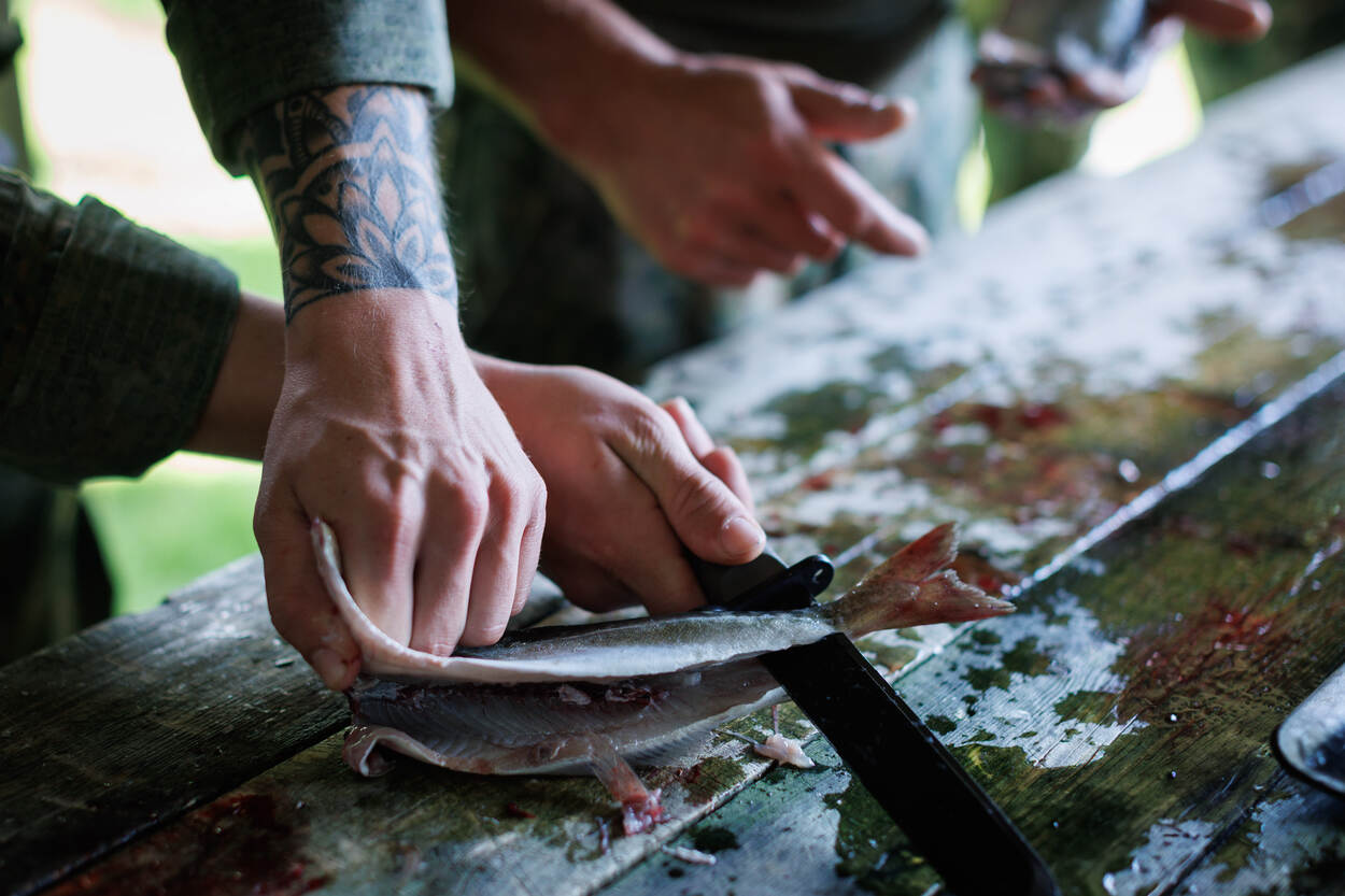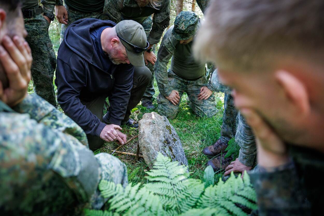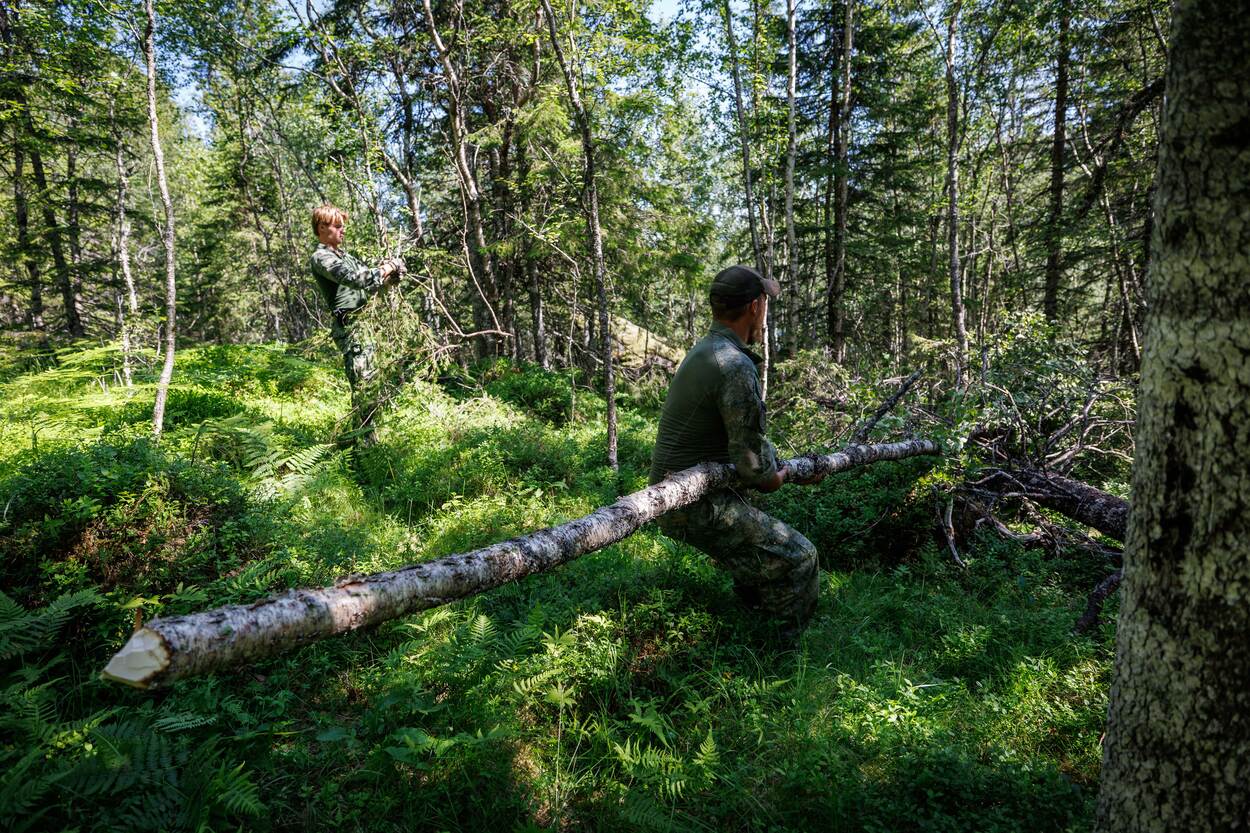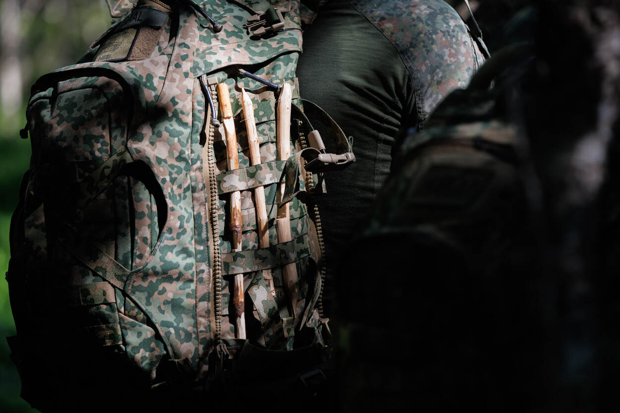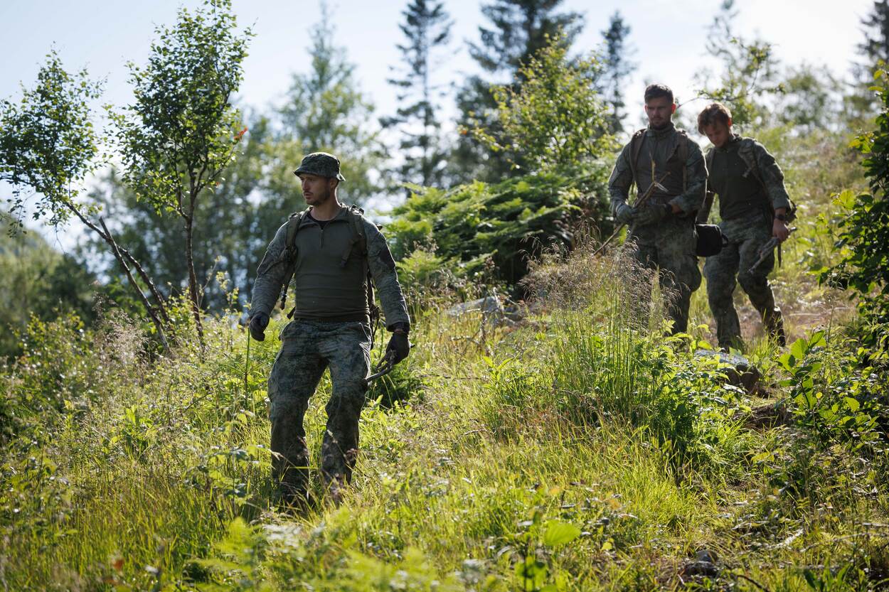 Iedere militair heeft basisvaardigheden die zijn of haar overlevingskansen tijdens missies vergroot, bijvoorbeeld ZHKH en wapengebruik. 44Recce ging in de provincie Nordland een stapje verder. De verkenners leerden skills om onder uitdagende omstandigheden te overleven met wat de natuur je biedt. Op de foto een set zelfgeslepen stokken om een val te kunnen maken. Verkenners treden vaak diep in vijandelijk gebied op om informatie te verzamelen over onder meer troepenbewegingen, commandoposten en wapensystemen. Wanneer zij om wat voor reden dan ook behind enemy lines zitten, moeten zij dwars door vijandelijk gebied veilig terug zien te komen. Dat zou bij een mobility kill ook te voet kunnen zijn. 44Recce gebruikte de periode in Scandinavië om beter te worden op verschillende gebieden zoals op oriënteren, vuur maken, vissen en onderkomens bouwen. De verkenners liepen pittige tochten en sloten de trip af met een loodzwaar scenario waarbij eten schaars was en de temperatuur opliep tot meer dan 30 graden. Eerste luitenant Kristiaan, pelotonscommandant (links in beeld): “Wij treden op in vijandelijk gebied, onder zware omstandigheden. De kans bestaat dat je dan niet volgens plan terugkomt bij eigen troepen. Helemaal in een hoofdtaak 1-scenario is dat een groot risico. Dat zien we terug in alle oefeningen die we doen. Als de verdediging bijvoorbeeld gesloten wordt of wanneer er te hard gevochten wordt om terug te kunnen komen.” “Op zo’n moment moet je overleven op het gevechtsveld. Daar komt een aardige portie zelfredzaamheid bij kijken: kunnen overleven met de beperkte middelen die je tot je beschikking hebt. Ik vind dus ook dat wat we hier nu doen essentieel is voor alle gevechtseenheden. Wat dat betreft is het jammer dat onze basisopleidingen steeds korter worden. Elementen die er vroeger standaard inzaten, komen nauwelijks terug.” Op de foto leren de verkenners een simpele val te zetten om bijvoorbeeld vogels of konijnen te vangen. “Marsrust inlassen bij lange verplaatsingen, navigeren met kaart en kompas, kledingdrills, een onderkomen maken: als jij denkt dat je natte sokken niet hoeft te verwisselen, of dat je die warme top niet aan hoeft te trekken als je even gaat zitten, word je in Noorwegen keihard met je neus op de feiten gedrukt. Daar zijn die jonge gasten tijdens de opleiding echter nooit tegenaan gelopen. Je kunt het ze niet eens kwalijk nemen.” “De lokale bevolking staat hier zoveel dichter bij de natuur. Een Noor haalt zijn vis gewoon uit het water, jaagt zelf en koopt geen water maar haalt dit lekker uit de beek. De natuur is prachtig en de oefening uniek. De landmacht heeft hier nog nooit eerder getraind, dus wat dat betreft is het een bijzondere kans. In het kader van behoud en motivatie is dit ook echt perfect.” “Doordat de basisopleidingen tegenwoordig zo kort zijn leg je de druk bij de eenheden om al die mensen op niveau te krijgen. Waar je eigenlijk wilt trainen om op een hoog niveau te komen, ben je alleen maar bezig met basiselementen verzorgen om mensen überhaupt basisopgeleid te krijgen. Het is zonde dat we daar zoveel tijd en energie aan kwijt zijn.” Sergeant-majoor Sietse, binnen 43 Mechbrig specialist Optreden Bergachtig Terrein en verantwoordelijk voor de oefening: “Toekomstmuziek is dat we dit jaarlijks terug laten komen, het liefst ook in dit gebied, omdat we het goed hebben leren kennen. Daarnaast hebben we hier een mooi netwerk en kan hier alles. Dat we dit bovendien kunnen combineren met optreden in bergachtig terrein is natuurlijk helemaal geweldig.” “Waar we hier nu met een peloton zitten, bouwen we dat het liefste uit naar een compagnie. Dat hoeven overigens niet alleen verkenners te zijn, maar kan net zo goed reguliere infanterie zijn. Op niveau 1 en -2 kun je in Noorwegen ontiegelijk veel leren in een hele korte periode. Het zou zonde zijn om dat niet over te dragen aan veel meer collega’s.”