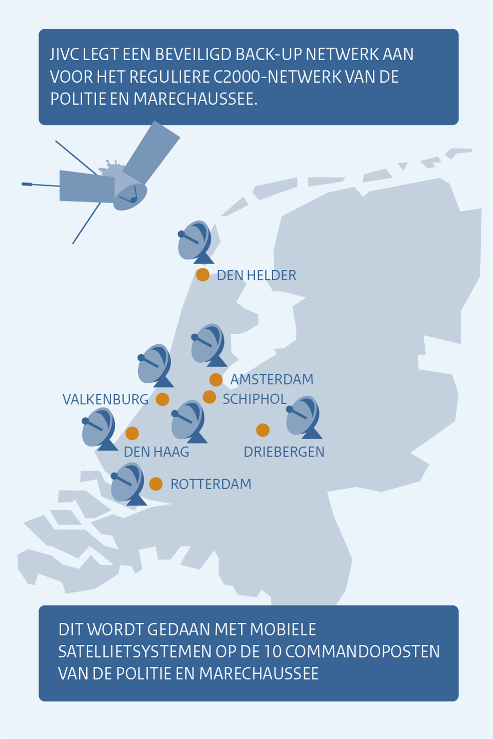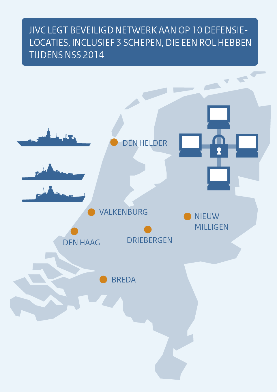 Voor de NSS lag het aanleggen van een veilige digitale infrastructuur complex, nog moeilijker dan voor Mali volgens Dirksen. ‘Als Defensie bedienen we vele spelers zowel voor als achter de schermen en op verschillende locaties van veilige netwerken. Ook hadden we daarvoor een heel back-upsysteem klaar staan voor het geval er problemen op het eerste netwerk ontstaan.’ Het JIVC legde een gerubriceerd netwerk aan op de 10 Defensielocaties, inclusief 3 schepen, die tijdens de NSS een rol hadden. Daarnaast zorgden de specialisten voor een back-up netwerk voor het reguliere beveiligde C2000-netwerk van de politie en marechaussee op de 10 commandoposten. Ook het portofoonsysteem voor de beveiligers van Huis ten Bosch en de hotels waarin de 58 wereldleiders vertoevden, voorzagen ze van een back-up netwerk.