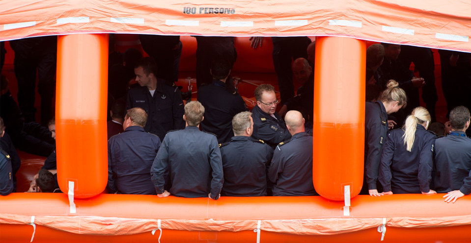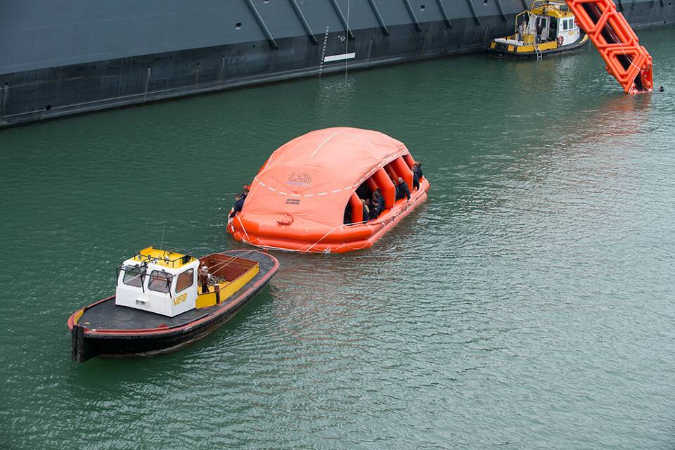 Hoe krijg je binnen 10 minuten 100 man van een schip zo groot en hoog als de Karel Doorman? Het antwoord daarop gaf de bemanning van het Joint Support Ship onlangs tijdens een oefening in de haven van Vlissingen.