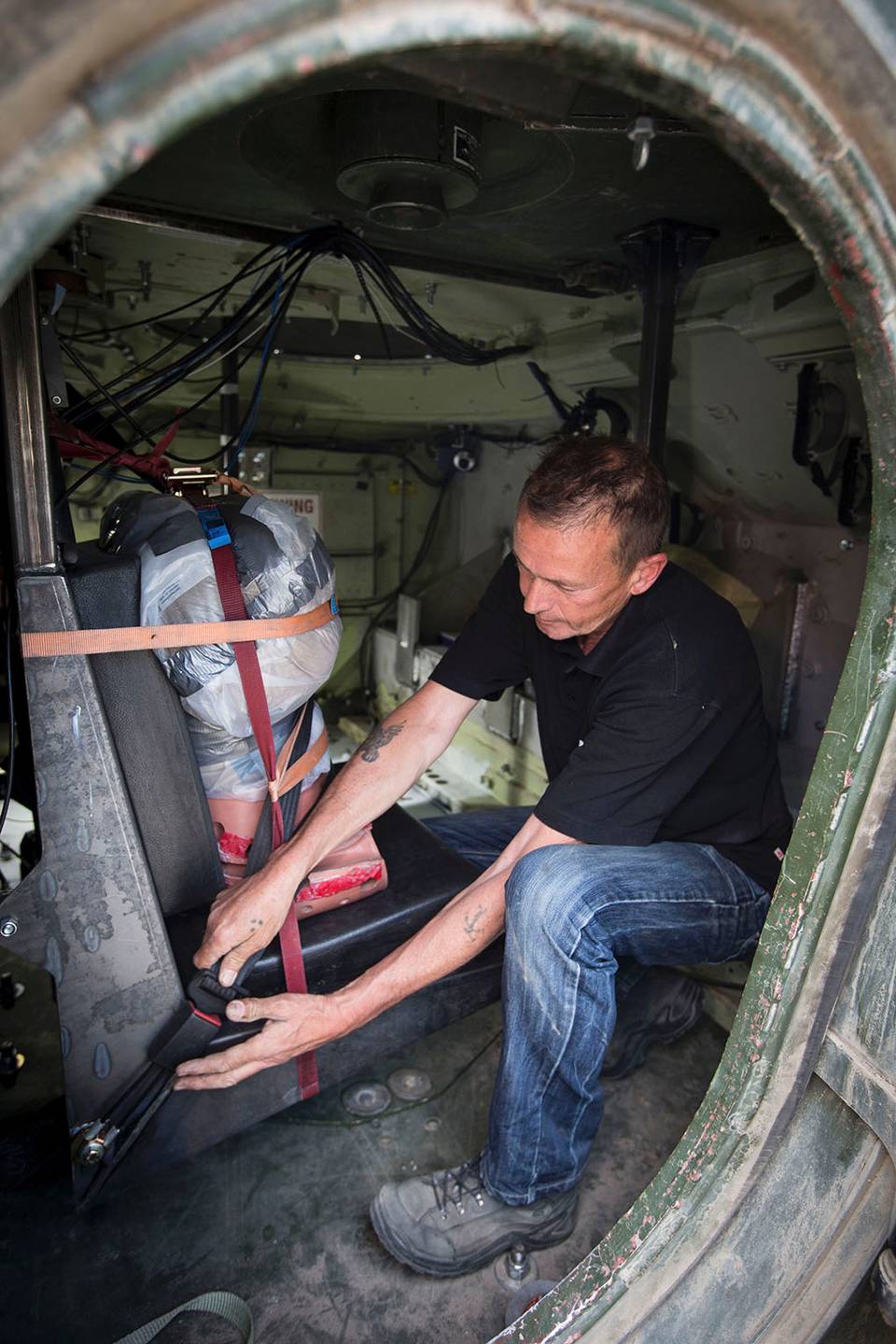 “De bodemplaten van pantservoertuigen zijn de laatste jaren aangepast aan de dreiging van bermbommen”, legt de projectleider uit. “De slachtoffers vallen nu juist na de detonatie. De explosie tilt het voertuig op, inclusief de inzittenden. Vervolgens landt alles en iedereen met een smak weer op de grond.”