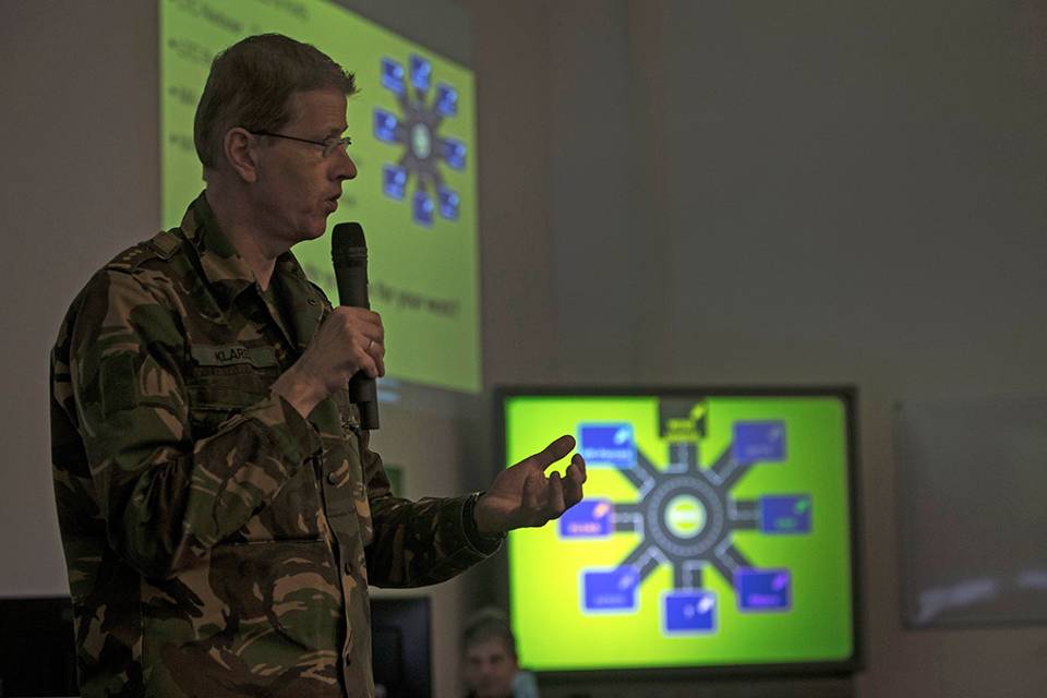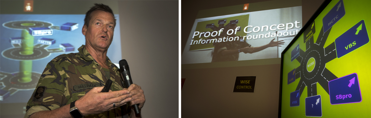 Maar de mogelijkheid om totaal verschillende systemen te integreren bestaat nu wel, bleek begin maart tijdens een demonstratie op de Bernhardkazerne. Daar toonden majoor Marco Hulleman, hoofd Research & Development van het Simulatiecentrum Landoptreden, en zijn team de werkbaarheid van software met de naam Informatierotonde. Daarbij zijn simulatoren en systemen als ELIAS, het Mobile Combat Training Centre en AFSIS (artillerie) aan elkaar gekoppeld.