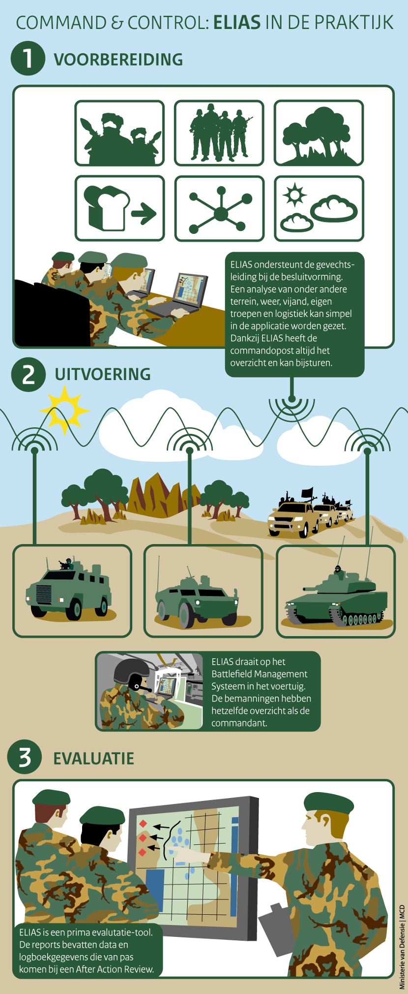 ELIAS maakt het mogelijk van hoog tot laag dezelfde software te gebruiken. De applicatie kan informatie uitwisselen met trainingssystemen en met NAVO-partners. “Nederland loopt op dit gebied echt voorop”, zegt Van Omme trots. “Integratie in de CV90, Pantserhouwitser, Fennek en Boxer is inmiddels gerealiseerd. Op dit moment wordt vooral gewerkt aan koppeling met VOSS (het project Verbeterd Operationeel Soldaat Systeem, red.)”