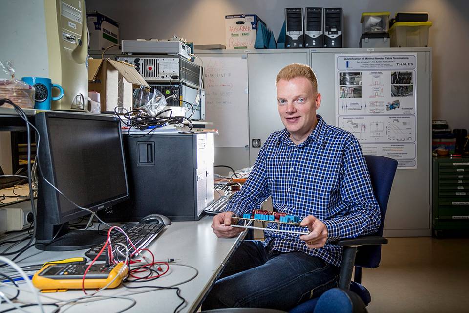 Van Leersum, sinds 2006 werkzaam als beleidsmedewerker Elektromagnetische Effecten, week voor zijn promotieonderzoek uit naar de Universiteit Twente. Daar ging hij de samenwerking aan met vertegenwoordigers van Damen, Imtech en Thales. “Vroeger was Defensie koploper in de ontwikkeling van elektronica”, merkt de DMO’er op. “Tegenwoordig ontwikkelt de industrie zich echter veel sneller. Daarmee de samenwerking aan gaan, is voor Defensie cruciaal.”