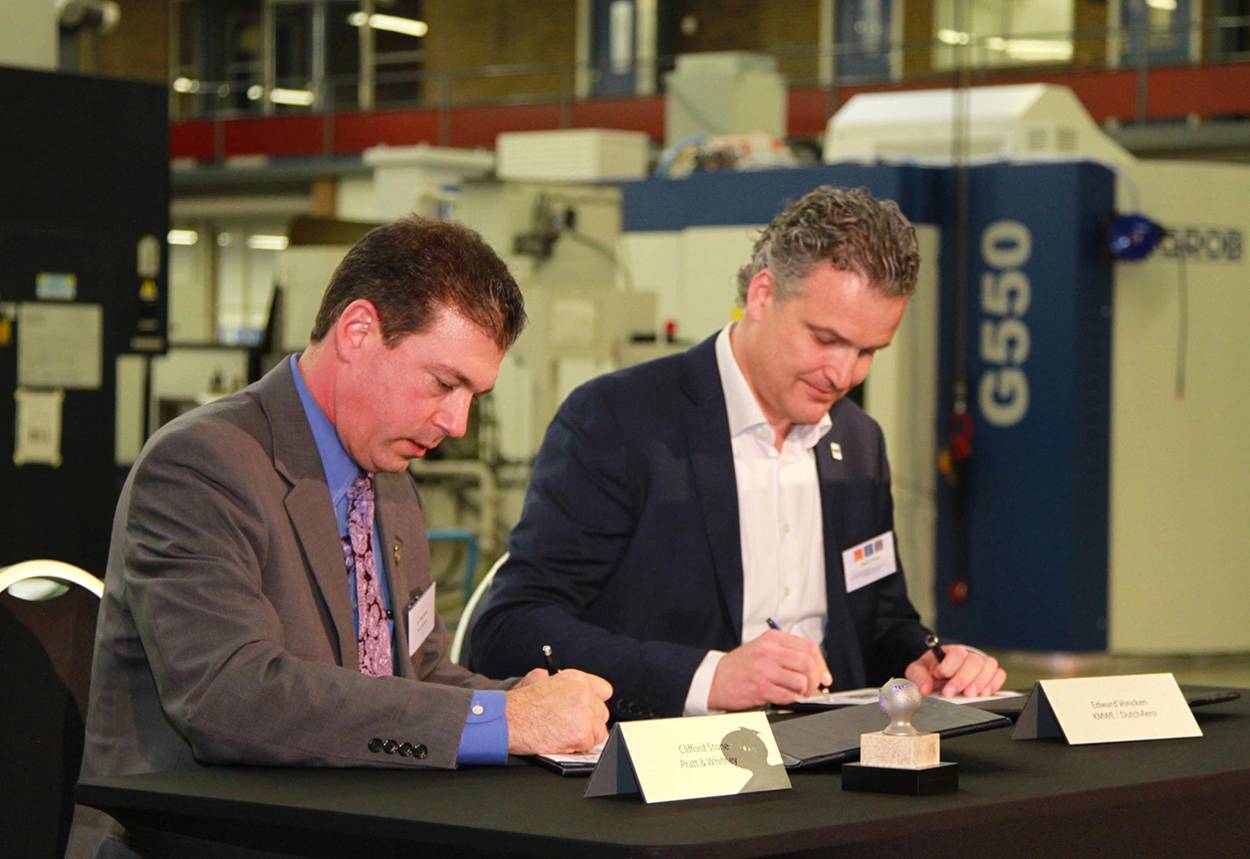 De ondertekening van het contract had plaats in de Brabantse lichtstad (zie foto onder). Het gaat om een investering van ruim 18 miljoen euro. De order heeft een looptijd van 10 jaar. DutchAero, sinds begin 2014 eigendom van KMWE, verzorgt de uitvoering.