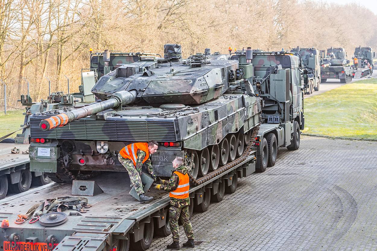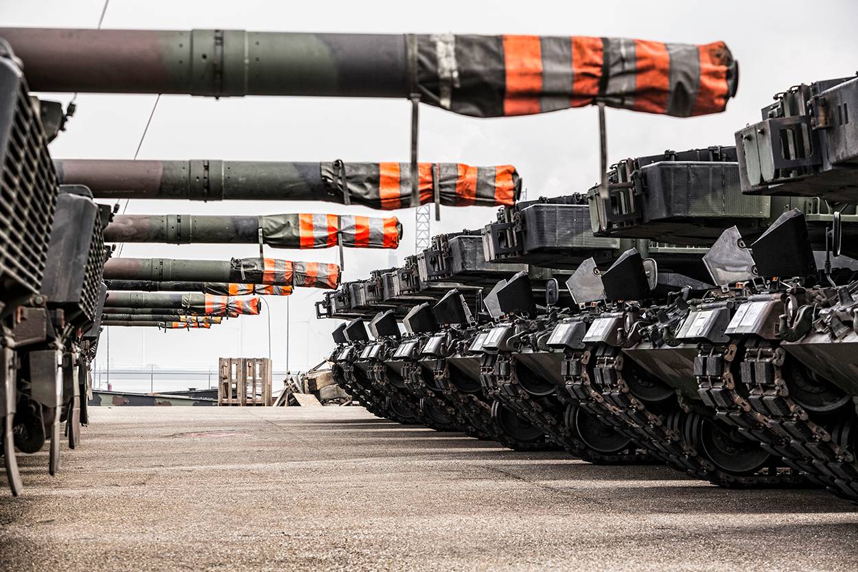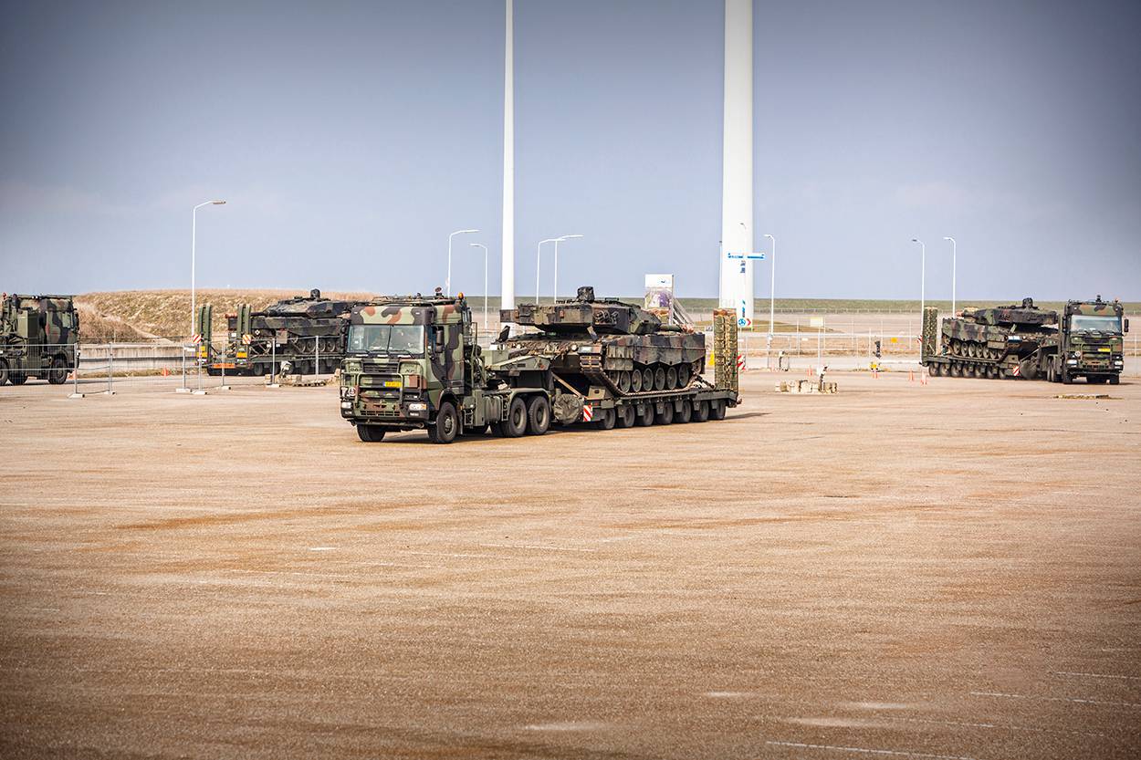 Het was een prachtig gezicht daar in de toch wat verlaten Eemshaven in Noord-Groningen: 20 Leopardtanks bij elkaar voordat ze het vrachtschip Finnsea oprijden. 60 staan er nog in de opslag in Almelo en Oudemolen nabij Assen. In die Drentse plaats brengen Defensiemedewerkers de voormalige tanks van de cavalerie in operationele staat voor de verkoop.