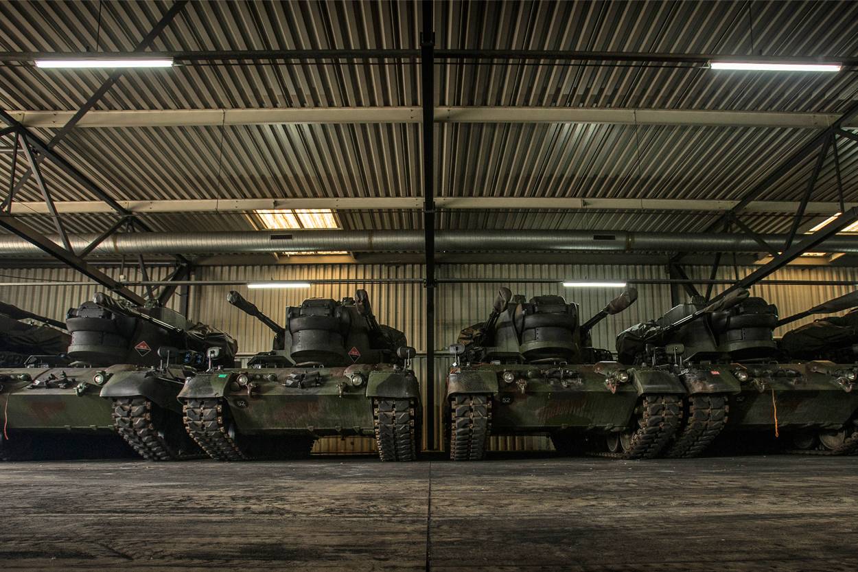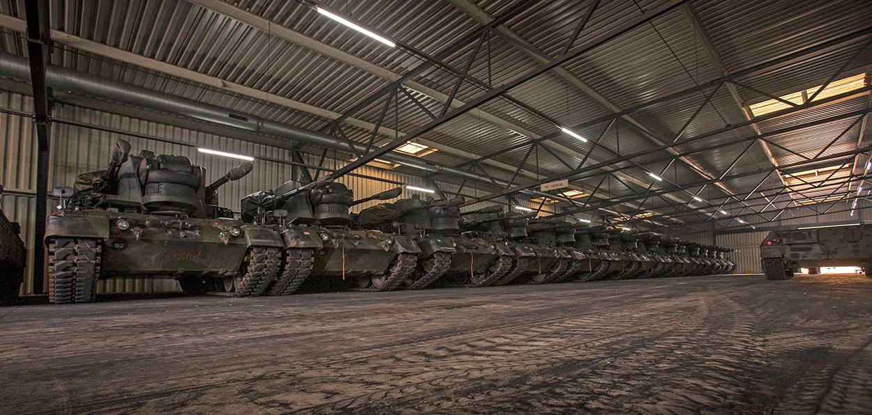 In de DMO-opslagloods op het Bedrijvenpark Twente hangt de typische geur van smeerolie en uitlaatgassen. De vuurmonden van 25 Cheetahs zijn afgedekt met plastic kokers. “Klaar voor transport”, zegt Meijerink, die de dagelijkse leiding heeft op de DMO-afstotingslocaties in Vriezenveen en Oudemolen.
