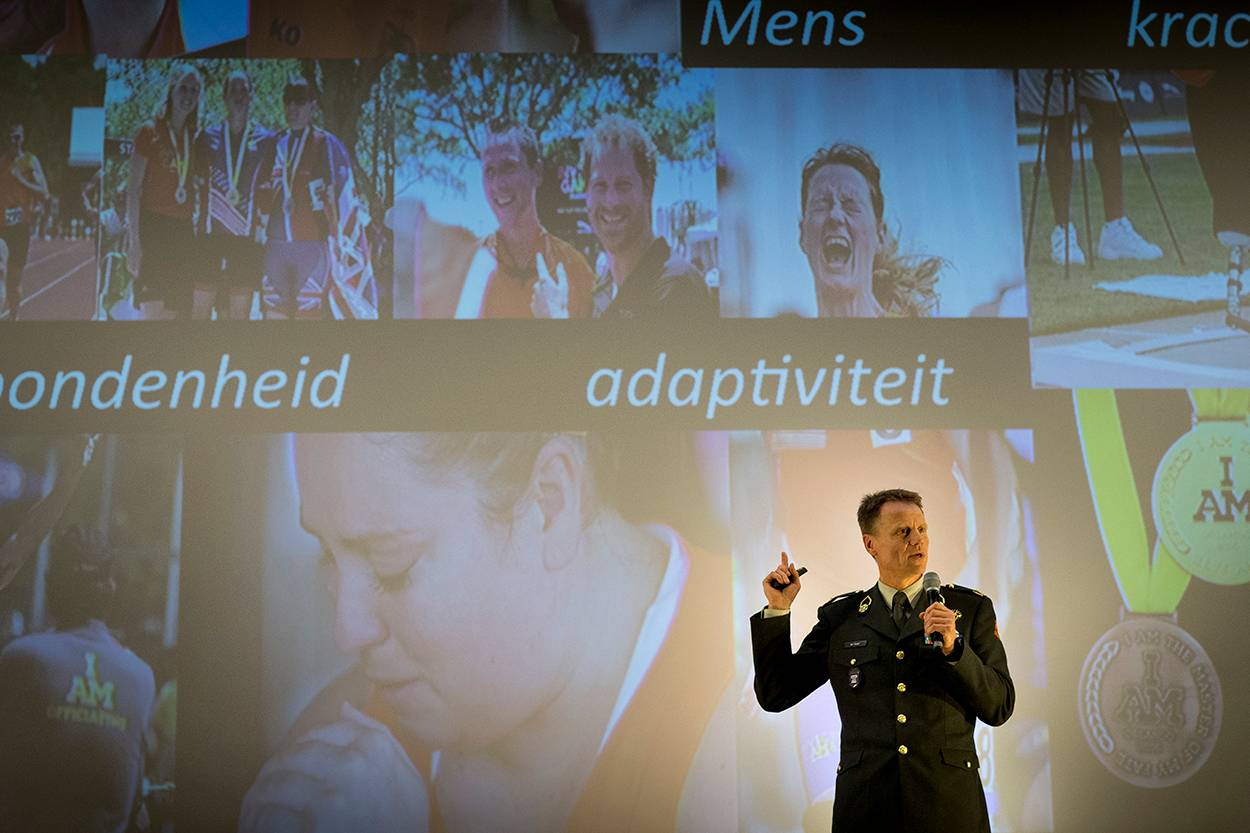 Ruim 400 medewerkers vanuit alle Defensie-onderdelen bezochten het Symposium in de bioscoopzaal van de Generaal-Majoor de Ruyter van Steveninckkazerne in Oirschot. Sociale innovatie gaat over wie je bent, met al je talenten en eigenaardigheden, en hoe je je zo kunt inzetten dat de organisatie innoveert en profiteert. Met Buzzmaster, een interactief systeem waarmee iedereen in real time via zijn telefoon vragen kan beantwoorden, werden alle bezoekers gedurende de gehele dag uitgenodigd om vragen te beantwoorden en feedback te geven. Op de vraag ‘ hoe innovatief vind je jezelf?’ antwoordde 55 procent zichzelf redelijk innovatief te vinden. Defensie als geheel kreeg een magere 5,2 voor de mate van innovatie. Michiel Hesseling, die bekend staat als de man die organisaties in beweging krijgt, liet bolletjes wol door de zaal werpen. Al die lijntjes die ontstaan laten zien dat je elkaar moet opzoeken, elkaar moet versterken en kennis moet uitwisselen. “Voel de verbinding. Stap op elkaar af en deel je kennis, je talent en deel je ervaring.” Brigadegeneraal-arts Johan de Graaf hield een sterk en eerlijk verhaal. “Onze uitdaging is om mensen sterker te maken, beter uit te rusten om die uitdagingen het hoofd te kunnen bieden. Je zou moeten groeien van stress en prikkels zoals een spier na lichte overbelasting. Het vereist samenwerking en continue dialoog van maatschappij, organisatie en de individuele medewerker.” Hoofddirecteur Bedrijfsvoering schout-bij-nacht Maarten Tossings vroeg iedereen eens in een ander bedrijf te kijken. “Zet de luiken open”. Sommige punten van sociale innovatie zijn niet overal inzetbaar. “Als je tijdens een missie onder vuur ligt, kun je moeilijk in werkoverleg gaan.” Als iemand de woorden van SBN Tossings kan bevestigen, is dat kolonel Jelte Groen. De commandant van het Korps Commandotroepen constateerde dat het KCT al aan sociale innovatie deed voordat de term ontstond. “We stimuleren en enthousiasmeren onze militairen in zelfsturing. Het komt bij ons voort uit noodzaak. Onze mensen moeten zelfstandig in een missie kunnen opereren en beslissingen durven nemen.”