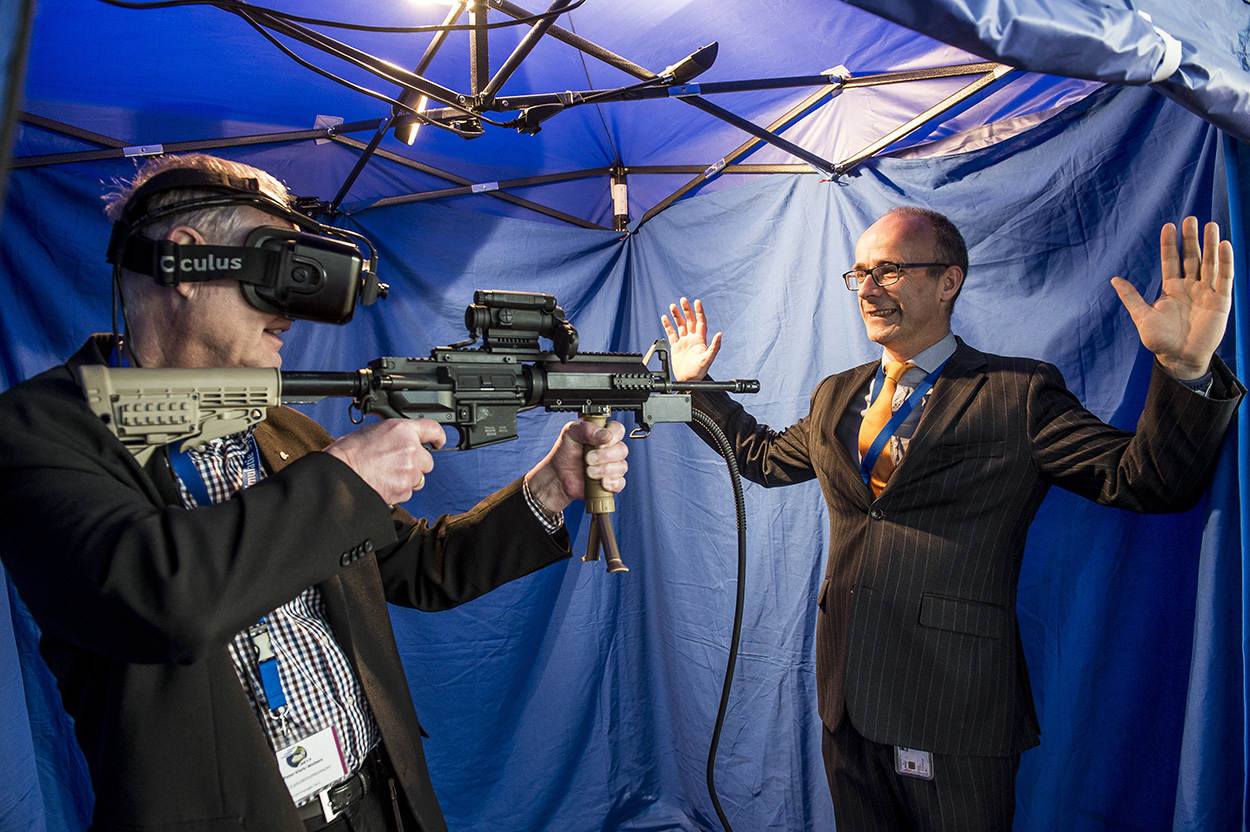 De vijand uitschakelen in een lege hal. Op zo’n 15 meter hoogte je toch onder de waterspiegel wanen of een fregat besturen vanuit een luie stoel. Het kon allemaal tijdens het tweede Defensie Simulatiesymposium dat dit keer in Den Helder werd gehouden. “De vermenging van de echte en de virtuele wereld is niet meer te stoppen. Het gaat steeds verder”, denkt plaatsvervangend commandant Zeestrijdkrachten schout-bij-nacht Rob Kramer.