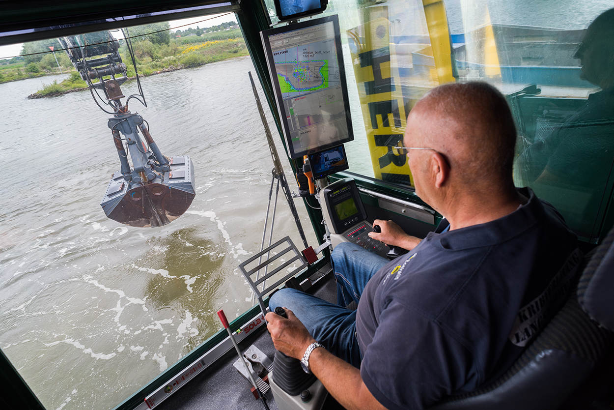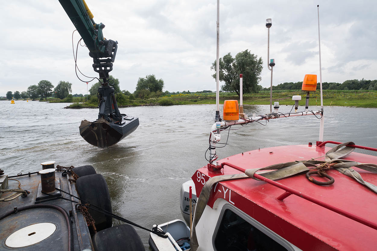 Een zware stalen balk zorgt ervoor dat de zinkmat naar de rivierbodem zakt. Daarna begint het lossen van het basalt. Met een mooie ‘zwiep’ weet de kraanmachinist iedere lading over een deel van de mat te verspreiden. Niewenhuis en De Bresser kijken toe. Ze hebben er vertrouwen in. “Die mannen doen dit niet voor het eerst”, weet Niewenhuis. Morgen krijgt het deel aan de zuidkant dezelfde afwerking en zit het karwei er op. Eind goed, al goed.
