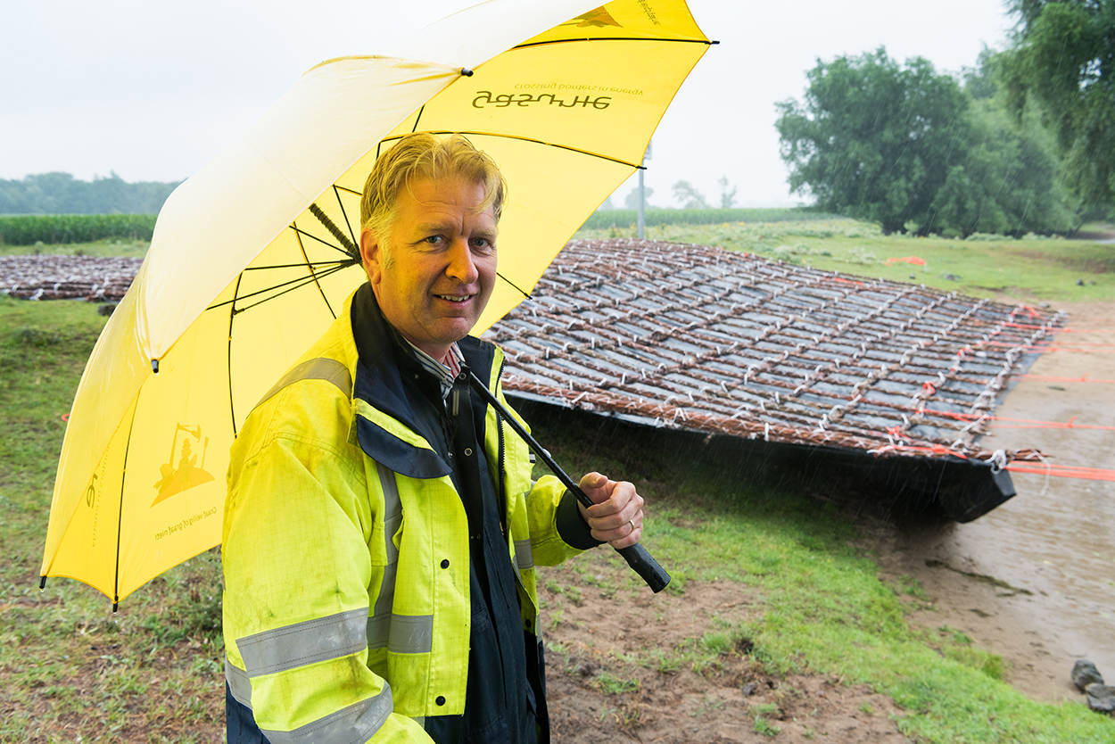 Hoewel op woensdag 12 juli de regen met bakken uit de hemel komt, gaan de werkzaamheden nabij beide waterkanten gewoon door. Aan de zuidkant (Bokhoven) is een kraan nog bezig zand aan te brengen. Aan de noordkant zijn de mannen van Van de Herik al vergevorderd. Alles ligt klaar om de 20 bij 50 meter grote zinkmat gecontroleerd en precies op de juiste plaats aan te brengen. Voor het benodigde drijfvermogen werd een rasterwerk van gevlochten wilgentakken aangebracht. Deze voorziening werkt super. De sleepboot trekt het ponton ‘Herik 22’ met de mat het water op. Na wat passen, meten en ‘nog eens kijken’ wordt die losgekoppeld van het ponton.