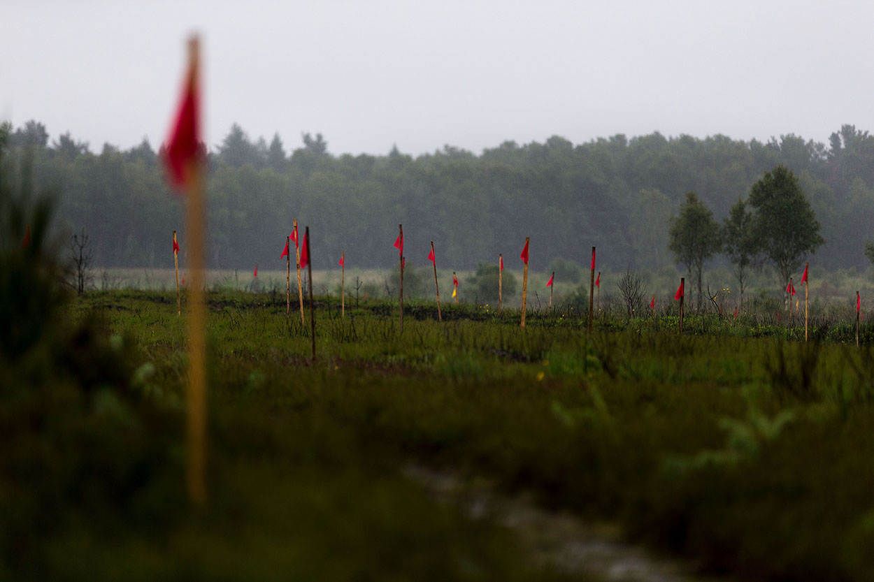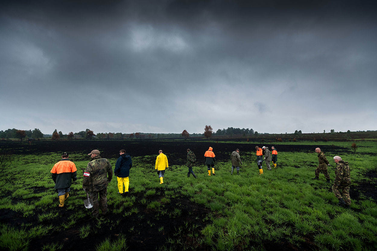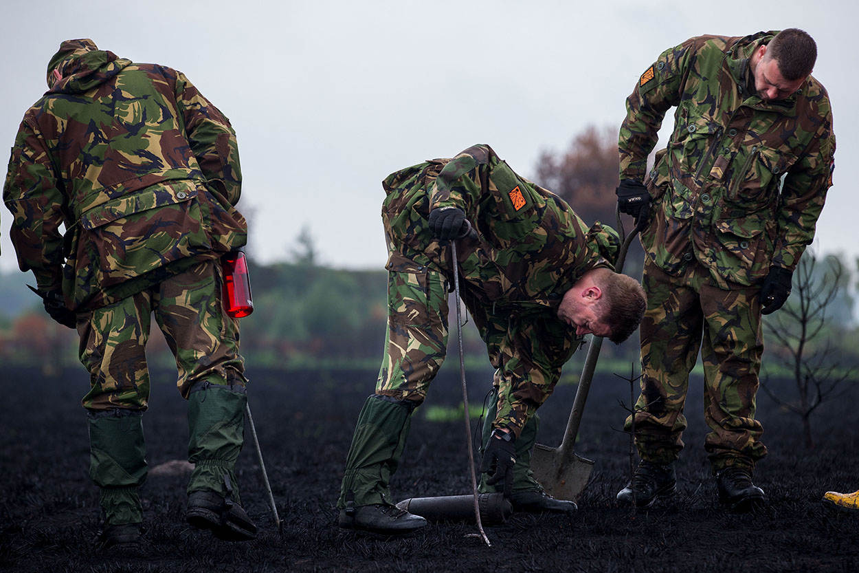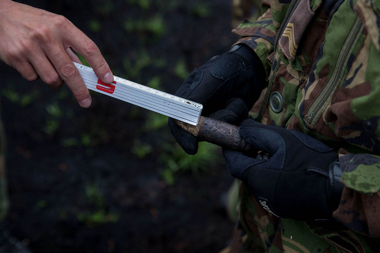 Het is er eerlijk gezegd niet de beste dag voor. Om zeven uur begint het Duits-Nederlandse ‘zoekteam’ in lichte motregen met de werkzaamheden, om 10 uur komt de neerslag horizontaal voorbij en dat duurt de rest van de dag. Het veld verandert in een zwarte brij. Enkele weken daarvoor heeft er brand gewoed, maar dat bevalt de technici juist wel. “Het is heel gemakkelijk vinden zo”, bevestigt sergeant-majoor Peter Karmelk van onder zijn capuchon. Met 6 Nederlandse en een peloton Duitse (burger)medewerkers is het zoeken naar iets bijzonders. “Het is net vissen”, vindt adjudant Wim Nederhoff, “je weet nooit wat je omhoog haalt. Dat maakt het spannend, zeker hier.”