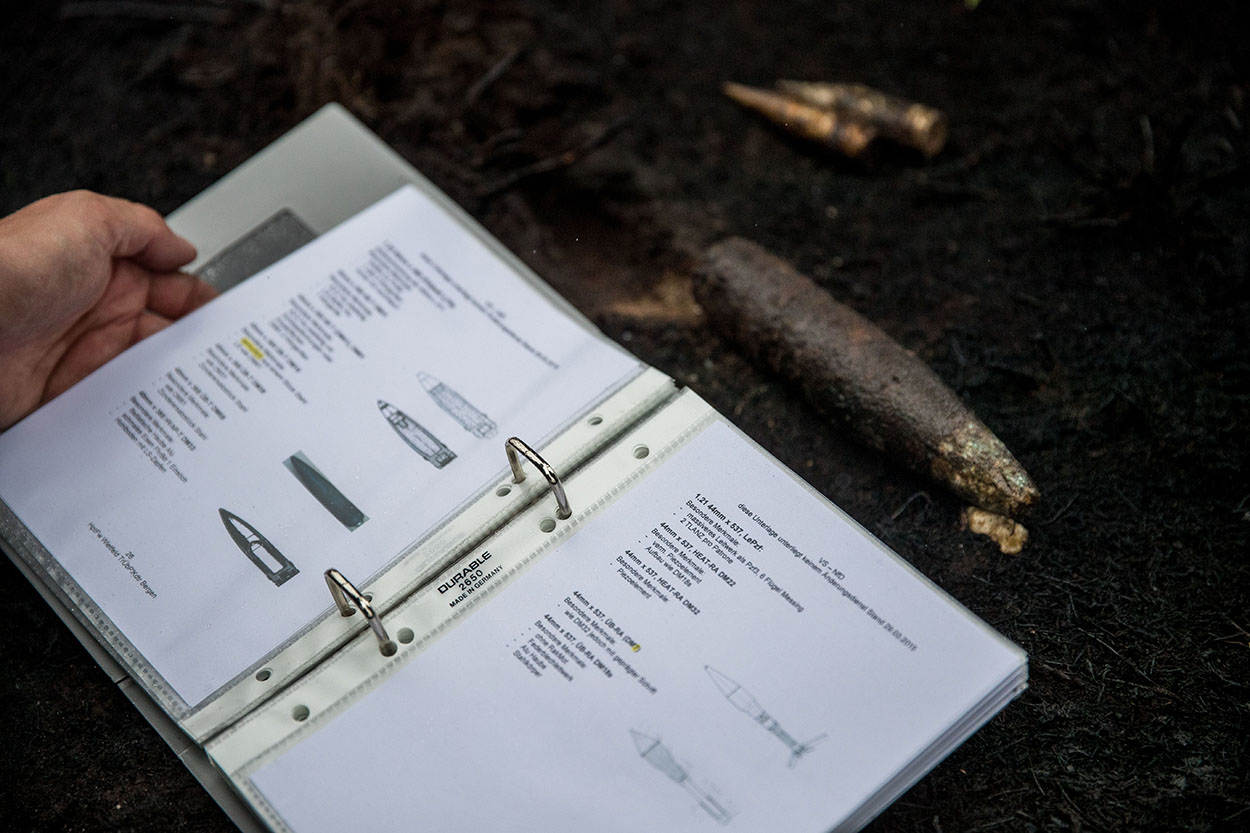 De Kommandatur des Trüppenübungsplatz Bergen heeft de opdracht elke 5 jaar de schietbanen schoon te maken. Er ligt niet alleen moderne munitie, maar uit de grond komen regelmatig restanten tevoorschijn uit de ruim 80-jarige geschiedenis van het terrein. Zoals hulzen van de K98k en das Maschinengewehr 34 die Berthold Pilat vond. Maar ook (102x27) 20cm van de Marder - de naoorlogse versie van de Duitse tankjager -, een 106mm afkomstig van de terugstootloze vuurmond M40A1 of 76mm Britse HE munitie van het Scorpion pantser-verkenningsvoertuig. Daar komt sinds kort nog munitie van oefenende troepen uit niet-Navoland Singapore bij. “Voor de lading hoef je niet zo bang te zijn, de vaak instabiele ontsteking vormt het probleem. Als die er nog opzit, moet je oppassen”, legt adjudant Jan Lanting uit.