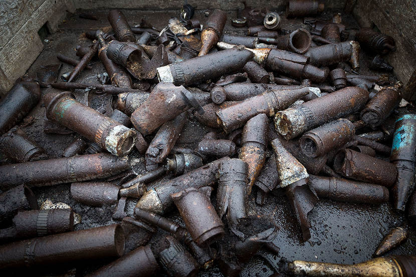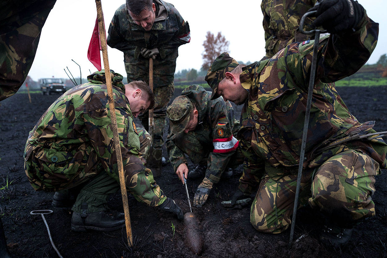 In een mum van tijd ligt de achterbak van de vrachtwagen vol met de resten van (oefen)munitie. Blindgangers – veelal 20 en 35 millimetermunitie – krijgen een rode vlag. “Die gaan we later springen”, aldus de Duitse leidinggevende, eerste luitenant Claudius, “zodat het terrein weer veilig is te betreden.”