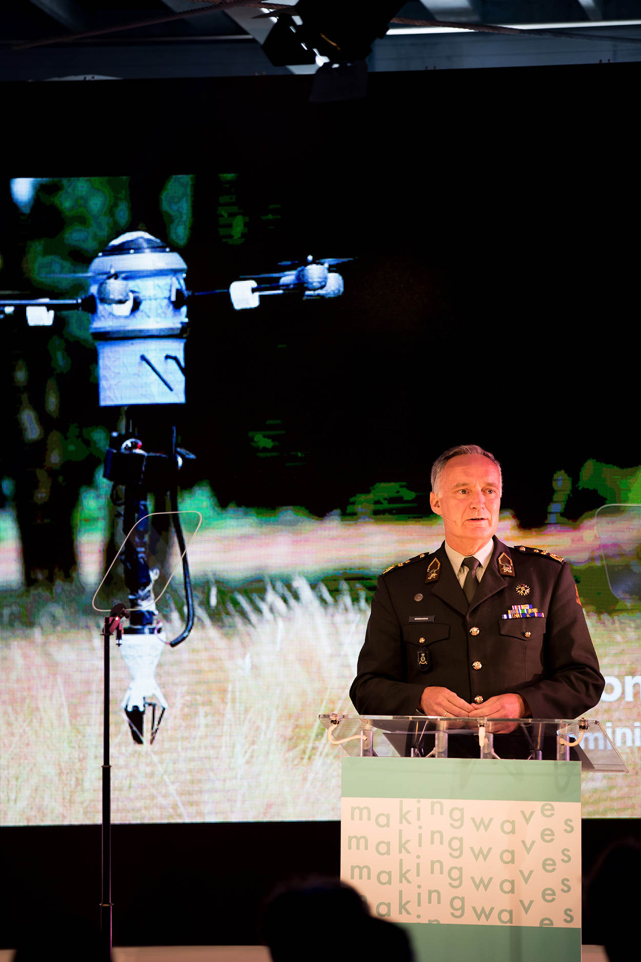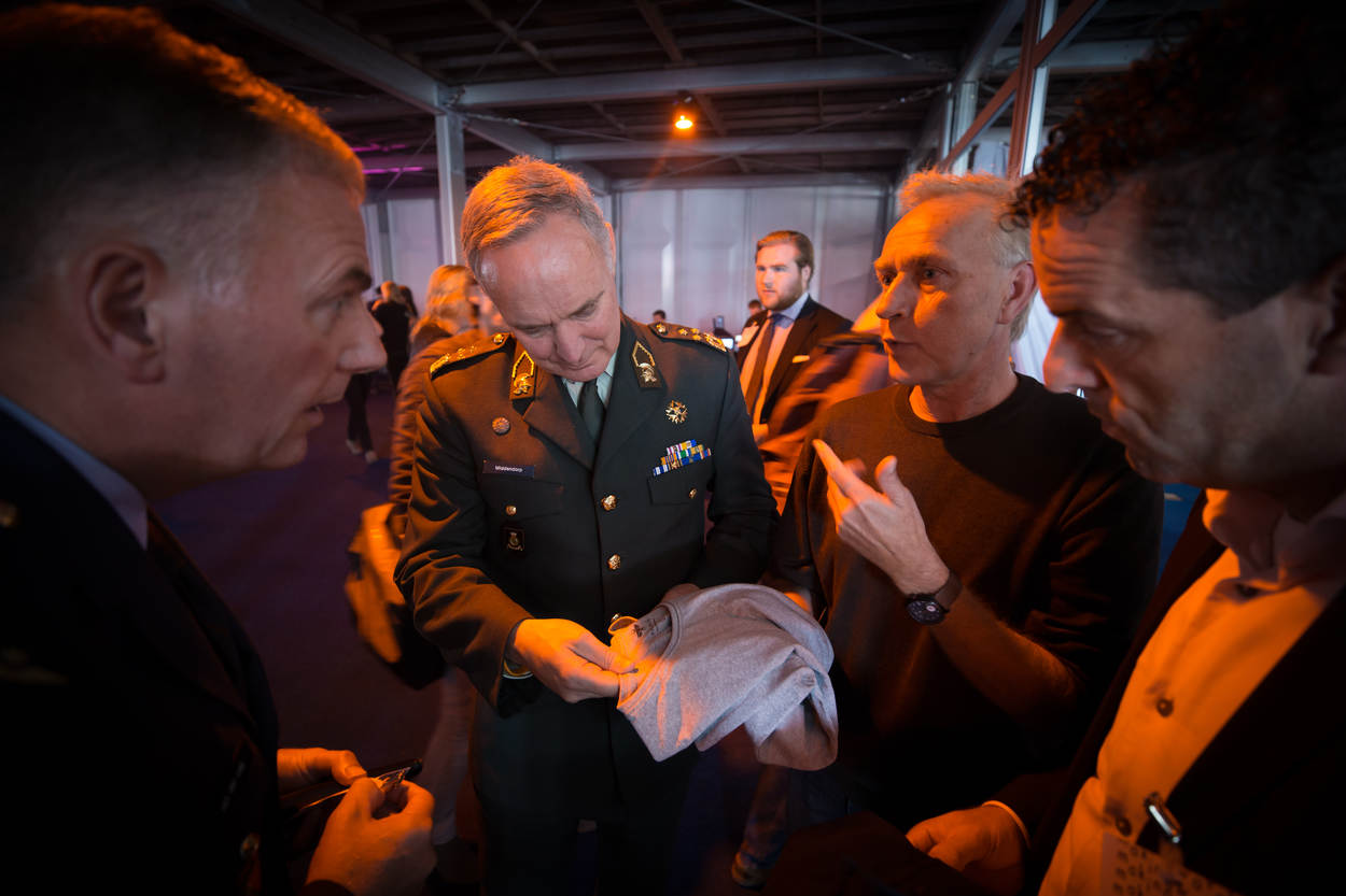 Een drone die mijnen opzoekt en vernietigt. Een waterval in de woestijn door vocht uit de lucht te halen. En jassen, wegverhardingsplaten, stoelen, tafels en bouwpalen die grotendeels uit versleten gevechtskleding worden gemaakt. Het waren 3 van de 17 toepassingen die werden gepresenteerd tijdens de manifestatie Making Waves, midden op de Afsluitdijk. “Een inspirerend evenement”, oordeelde DMO’s Mireille Hendriks-De Jonge, contractmanager bedrijfskleding Rijk.