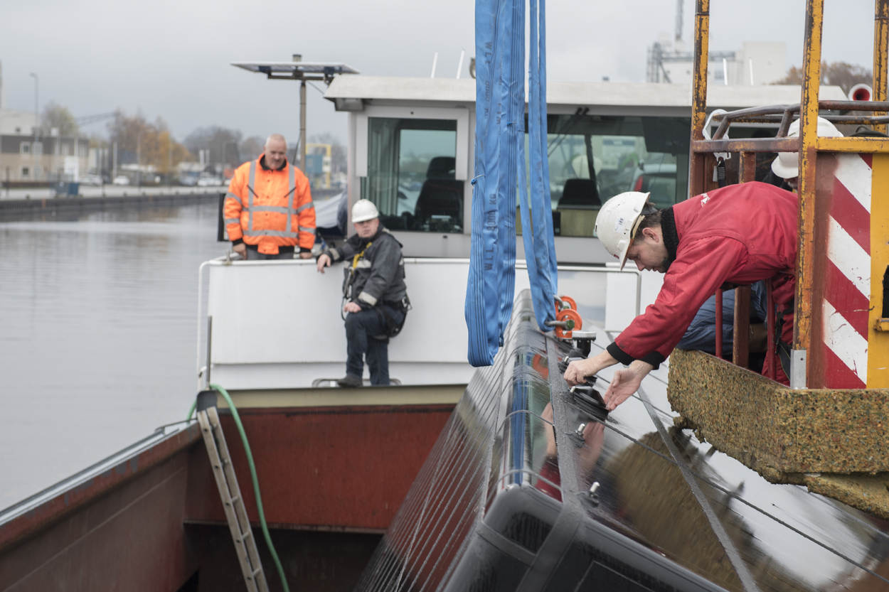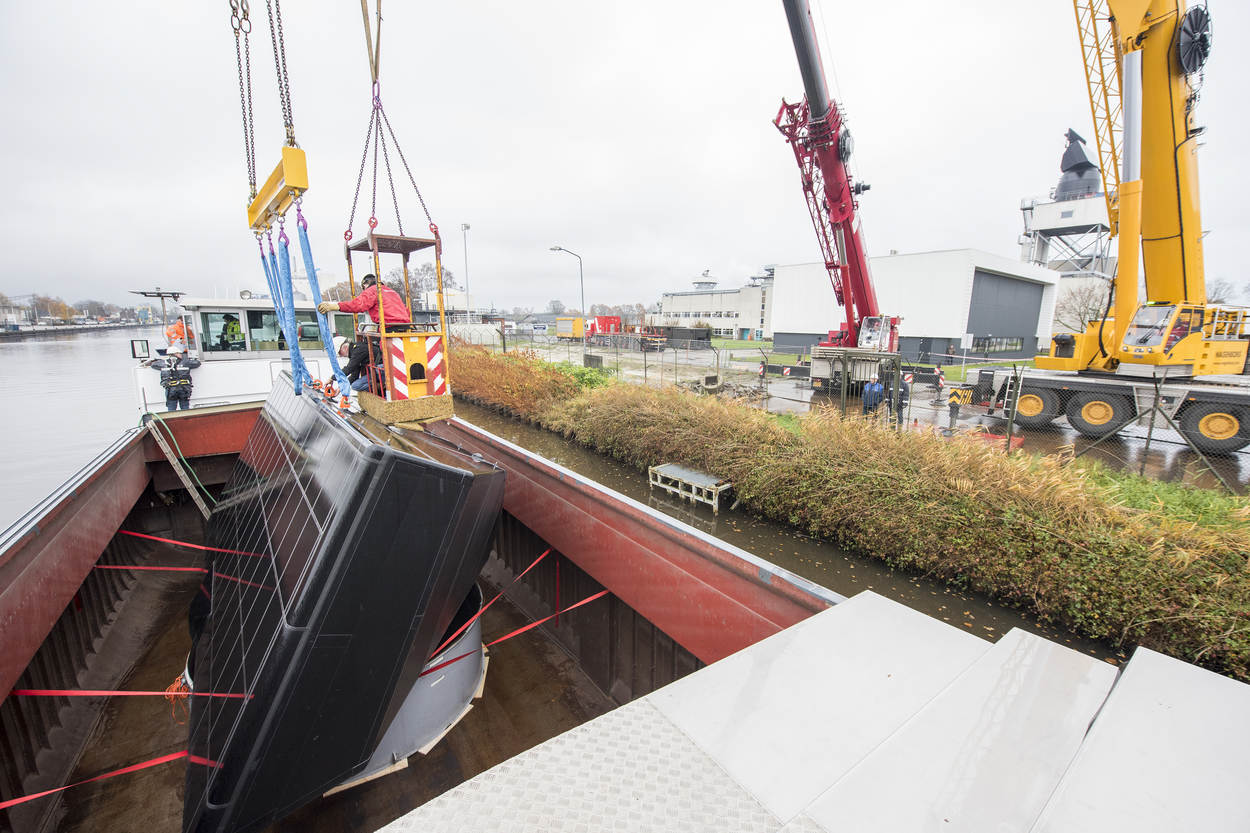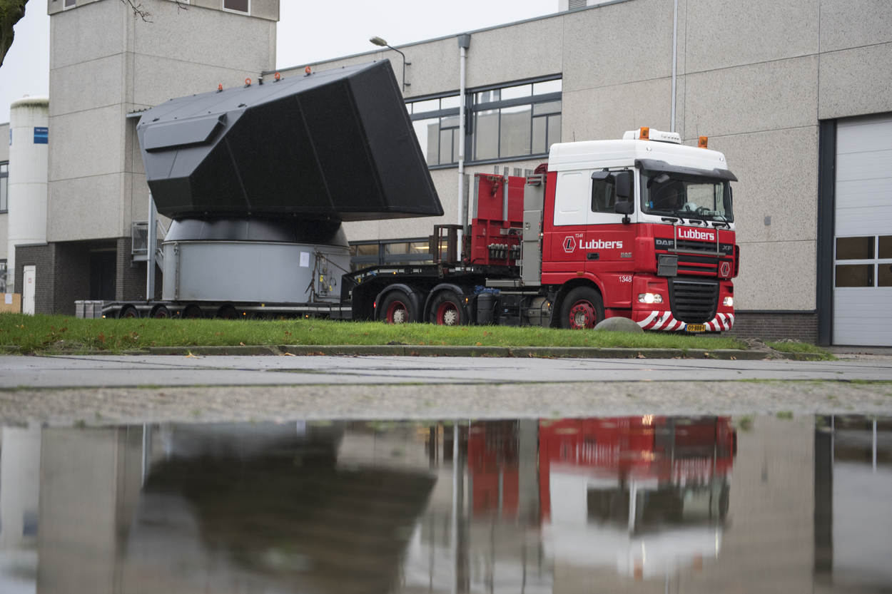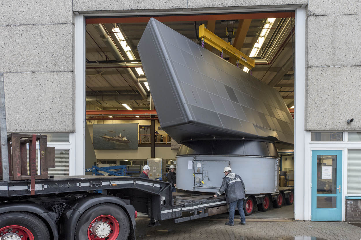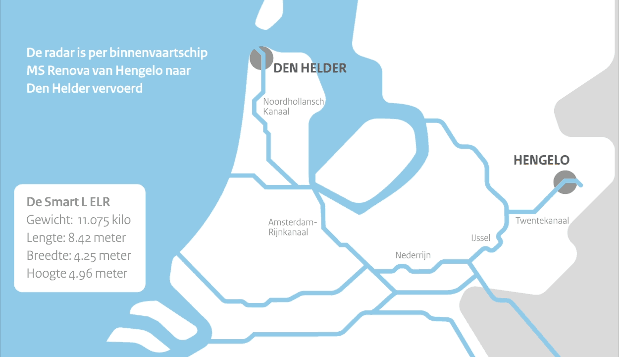 Het was opnieuw een markant moment in het project. Na een tocht van een weekeinde arriveerde de eerste SMART-L ELR radar per binnenvaartschip in Den Helder. Vanuit Hengelo, thuishaven van leverancier Thales Nederland. Namens de marine tekende de plaatsvervangend directeur van DMO generaal-majoor Ivo de Jong voor ‘ontvangst’; namens Thales Geert van der Molen, verantwoordelijk voor marinezaken. Defensie schafte bij het bedrijf trouwens 6 SMART-L ELR-radars aan: 4 voor het Commando Zeestrijdkrachten, 2 voor air control doeleinden bij de luchtmacht.
