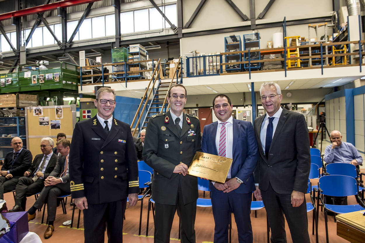 V.l.n.r. kapitein-luitenant ter zee Bert Helder, generaal-majoor Ivo de Jong, projectmanager Armando Spinosa van Thales en Geert van der Molen van Thales. Het eerste exemplaar van de SMART-L ELR staat bij Directie Materiële Instandhouding in Den Helder. Plaatsvervangend directeur DMO generaal-majoor Ivo de Jong tekent namens Defensie; Geert van der Molen, verantwoordelijk voor marinezaken, voor Thales.