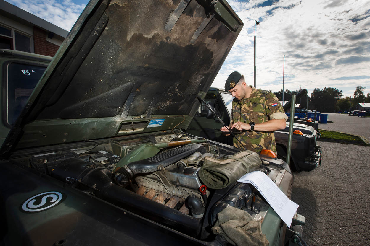 Projectleider ir. Juriën Verweijen van Kennis, Innovatie, Experimenten en Simulatie (KIXS) van het Joint IV Commando: “Een chauffeur moet na een rit altijd een voertuigcheck uitvoeren en de 300 punten tellende roze lijst invullen. Alles moet kloppen, variërend van banden tot en met oliepeil. Aan de hand van de lijst controleert een groepscommandant in welke technische staat voertuigen verkeren en of ze inzetbaar zijn voor een missie of oefening. Uiteindelijk komt de checklist terecht bij de Onderhouds-, Diagnose- en Bergingsgroep (ODB) van het peloton. Die beoordeelt de actiepunten en voert zo nodig reparaties uit.”