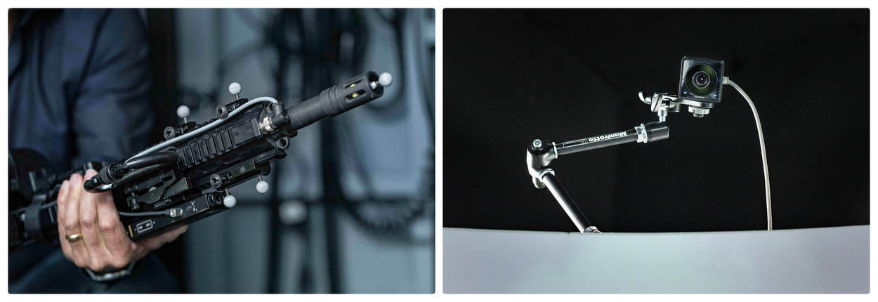 De nieuwe HK417-simulator werd 25 oktober opgeleverd, nadat het alle testen in de doorgunner-simulator op de vliegbasis Gilze-Rijen doorstaan had. Ook Raymond Bergshoeff, de Nederlandse vertegenwoordiger van het Amerikaanse bedrijf, is zichtbaar in zijn nopjes. Hij pakt het wapen op en wijst naar de witte bolletjes: “Deze sensoren worden gevolgd door die 3 camera’s op de rand van de dome. Daarmee kan de software precies de positie van het wapen bepalen en berekenen of de schutter raak schiet.”