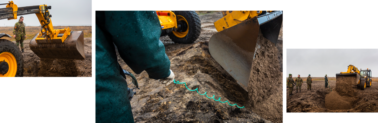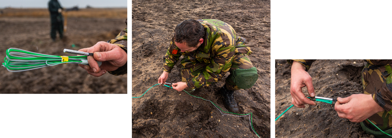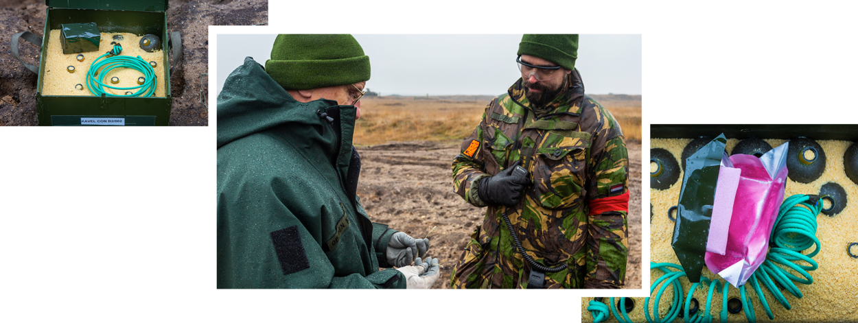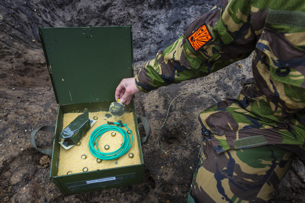 Om de omgeving zoveel mogelijk overlast te besparen, gaan de kisten met granaten een diepe kuil in en wordt er met beleid zand overheen gestort. “Het weer van vandaag is wat dat betreft wel ongunstig. Als de grond is verzadigd met water en er veel bewolking is, draagt de drukgolf verder. Voor de geluiddemping doen we er een extra laag zand op.”