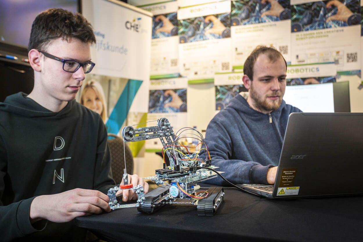 Onder begeleiding van defensiepersoneel gingen zij aan de slag. Frank Blankespoor (17) doet de MBO-opleiding applicatie- en mediaontwikkelaar en bouwde met andere studenten een autonoom bergingsvoertuig. “Op de eerste dag kregen we een probleem gepresenteerd. Daarvoor moesten wij een oplossing op papier zetten en een prototype ontwikkelen. We kozen voor een zelfrijdend rupsvoertuig met een sterke magneet. Die kun je variabel instellen op basis van de grootte van het te bergen voertuig. Vergeleken met een kraan en grijper is een magneet minder kwetsbaar. Het is best vet om naar mogelijke oplossingen te zoeken. Eerst stond het voertuig op wielen maar in zwaar terrein bleken rupsbanden beter werk te leveren. Dat hebben we op de laatste dag aangepast.”