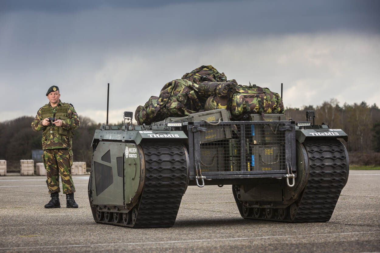 Om een infanteriegroep te ontlasten zijn autonome wagens een mogelijke oplossing. Bij de dit jaar gevormde Robot en Autonome Systemen (RAS) eenheid bij 13 Lichte Brigade zijn een rups- (Milrem THeMIS) en wielvoertuig (Rheinmetall Mission Master) als pilot in gebruik. Beide voertuigjes kunnen op afstand bediend worden met een joystick en volgen autonoom op basis van GPS een ingestelde route. De rijdende robots sjouwen honderden kilo’s aan tassen, munitie en voedsel mee maar zijn ook in te zetten als onbemande ambulances, verkenningsvoertuigen of zelfs wapensystemen. De volgfunctie laat de voertuigen automatisch in het gelid van een militaire groep rijden. Adjudant Gerard van der Sangen van de RAS-eenheid heeft er nu een aantal in beheer: “We hebben nu 2 wiel- en 6 rupsvoertuigen rondrijden. In de bevoorrading van vooruitgeschoven troepen kan zo’n klein wagentje een 4-tonner vervangen. Een autonoom voertuig is stil, wendbaar en heeft geen bestuurder nodig.”