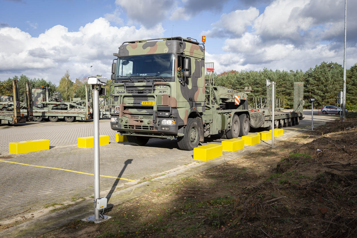 Adjudant Materieelverzorging Martin Peters legt uit hoe het werkt. “In het wegdek zit een drukplaat met lasers en aan de zijkant staan 2 camera's. Het systeem meet volledig geautomatiseerd de asdruk, de bandenspanning en de profieldiepte van alle banden. Die gegevens kan de chauffeur uitlezen op een display aan het eind van de sluis. Hij ziet dan gelijk of er iets niet klopt en kan dat dus corrigeren voor 'ie de weg op gaat. Te weinig bandenspanning? Even bijpompen! Te zware asdruk? Lading aanpassen! Niet genoeg profiel meer? Band laten wisselen in de garage. Alles beter dan onderweg stil te komen staan met alle gevolgen van dien.”