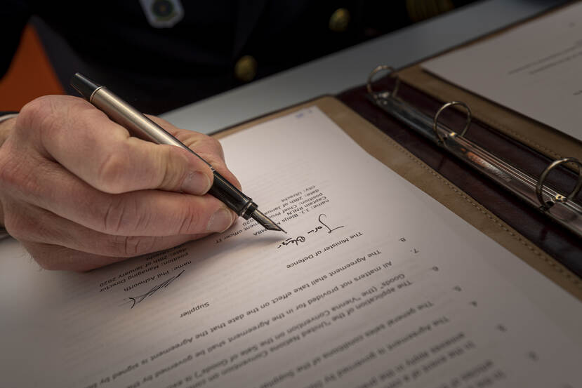 Hoofd inkoop IT kapitein ter zee Jorn Bleijs tekende de overeenkomst met de Britse leverancier Exensor UK.