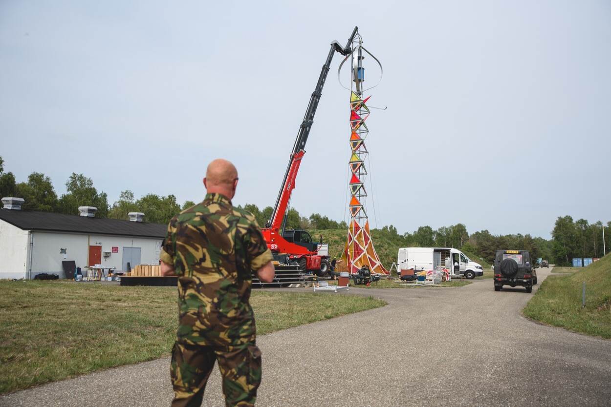 De 25 meter hoge toren blijft een maand staan op het FieldLabSmartBase van het concept development & experimentation (CD&E). Dat is een relatief nieuwe landmachteenheid die zich richt op het ontsluiten van het innovatieve vermogen van het bedrijfsleven en kennisinstituten voor het moderniseren van de krijgsmacht.