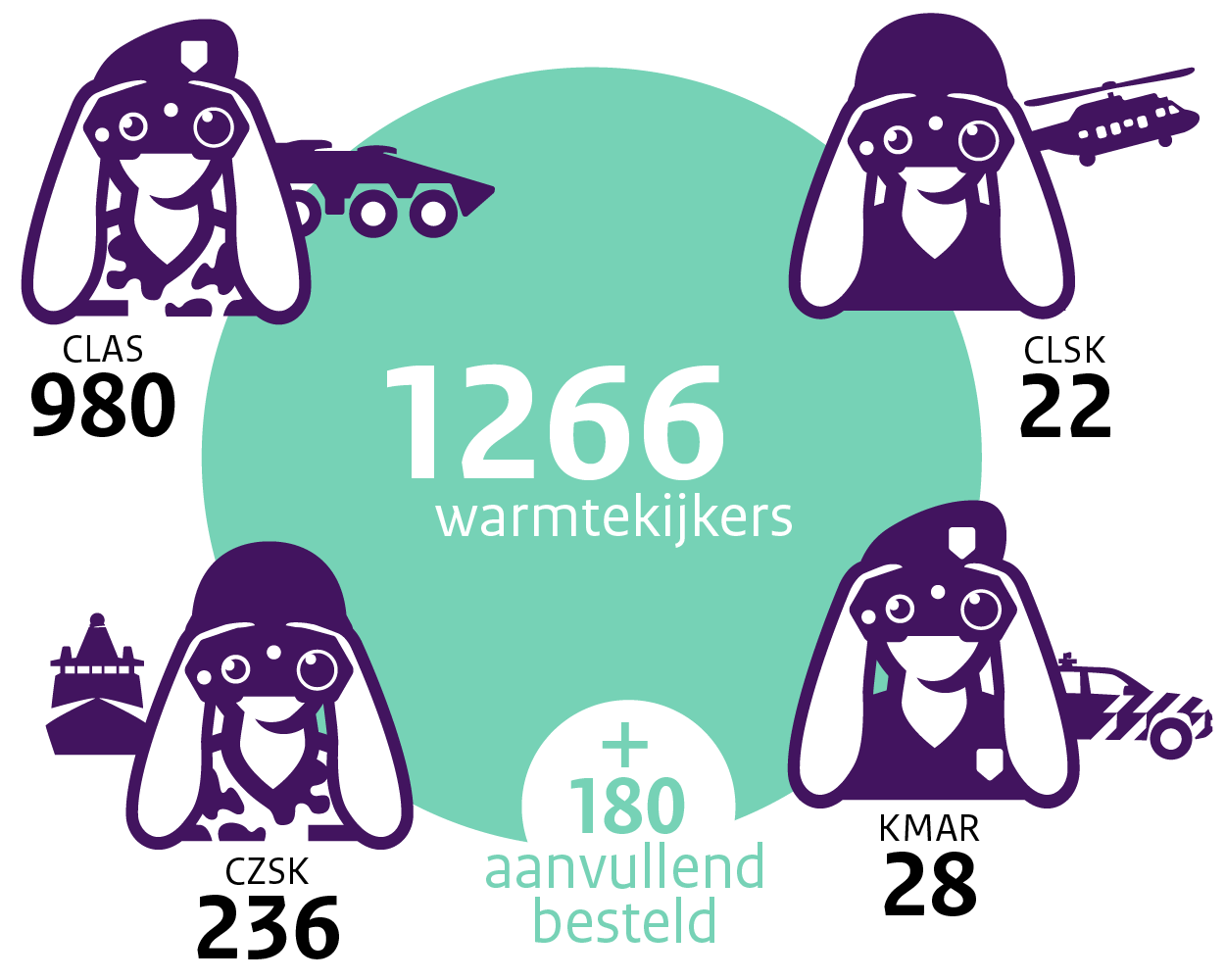 In mei 2018 werd het contract voor 1.266 kijkers getekend. “Dat was het maximale aantal dat we toen financieel aan konden. Inmiddels ligt er een aanvullende opdracht voor 180 extra exemplaren, onder andere voor Vessel Protection Detachments (VPD). De operationele behoefte ligt rond de 1.500. De levering loopt als gepland. Elke kwartaal krijgen we er 150 binnen, de laatste kijkers in het eerste kwartaal van 2021.” Met het nieuwe Thermal Handheld Imaging System (THIS) zoals de kijker binnen Defensie heet, kunnen de eenheden weer jaren vooruit. “Mogelijk komt er een integratie met het Verbeterd Operationeel Soldaat Systeem (VOSS link naar https://magazines.defensie.nl/materieelgezien/2019/01/10_sluwe_voss). We hebben in ieder geval een 10-jarig contract voor ondersteuning in reservedelen en opleiding. Uiteindelijk wil je dat onze militair over goed materiaal beschikt.”