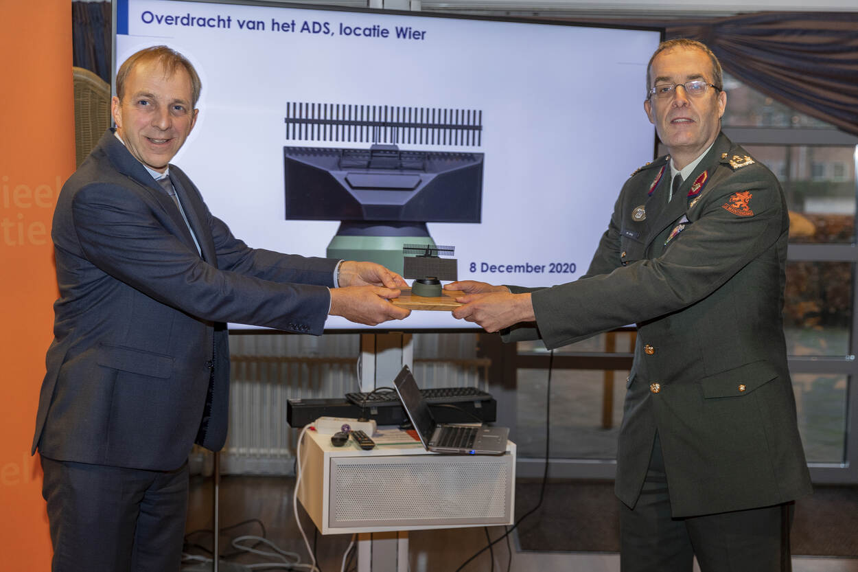 Generaal-majoor Ivo de Jong van de Defensie Materieel Organisatie (foto rechts) nam de nieuwe radar officieel in ontvangst van Thales BV. De radar wordt de komende periode getest en daarna officieel in gebruik genomen. Testen doet het projectteam van DMO met het Commando Luchtstrijdkrachten en gebruikers van het Air Operations Control Station Nieuw Milligen.