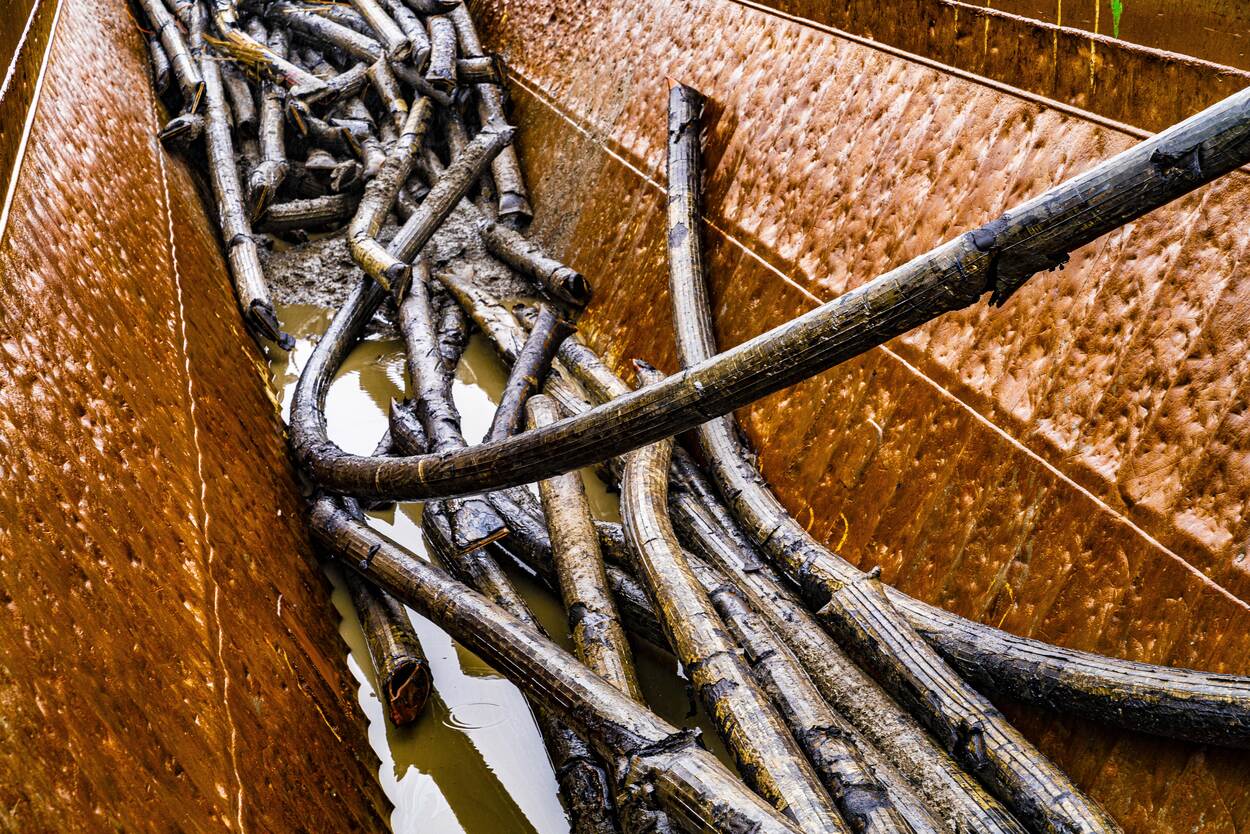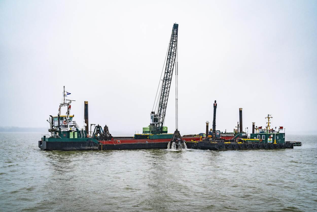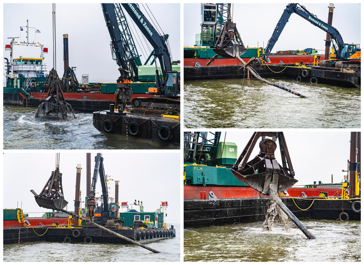 De vorst van de afgelopen week heeft geen roet in het eten gegooid, laat projectleider Rob Bhaggoe van de DPO weten. Op het schip Prins 2 van de firma Van den Herik uit Sliedrecht is het dan ook een drukte van belang. Een grijper zoekt telkens op het relatief ondiepe water – zo’n 9 meter – naar de oude buizen van de brandstofsnelweg Pernis-Woensdrecht (PW). “De leiding, die ongeveer een meter onder de grond ligt, wordt opgetakeld en vervolgens in stukken geknipt. Dat gebeurt boven het schip, want we doen onze zaken vanzelfsprekend milieubewust.”