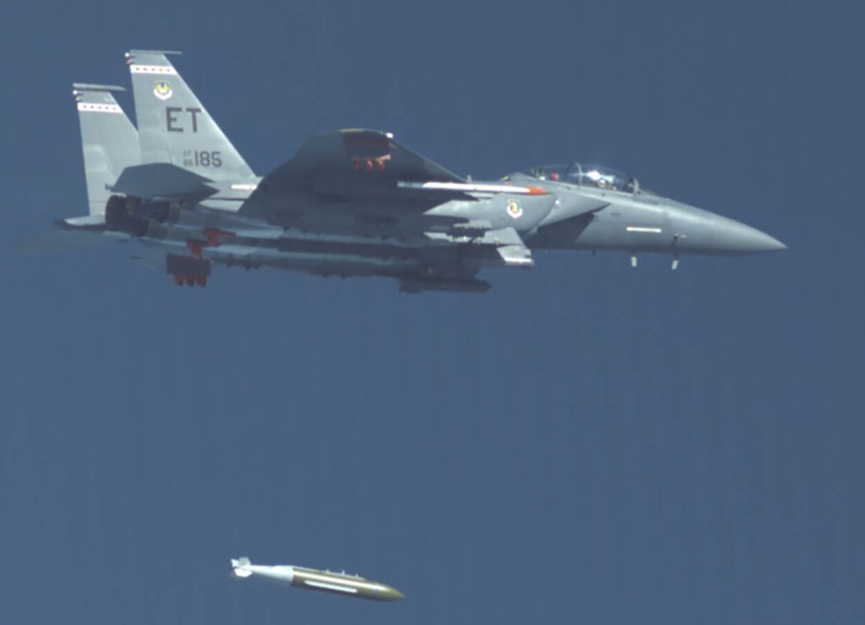 Een F-15E Strike Eagle gevechtsvliegtuig liet vorige week deze GBU-72 Advanced 5K Penetrator-bom vanaf 35.000 voet, ruim 10,5 kilometer, los boven een testinstallatie bij Eglin Air Force Base (Florida). Met succes. Het gaat om een zogenoemde slimme bom (joint-direct-attack-munition, JDAM), dus GPS-geleid voor de precisie.